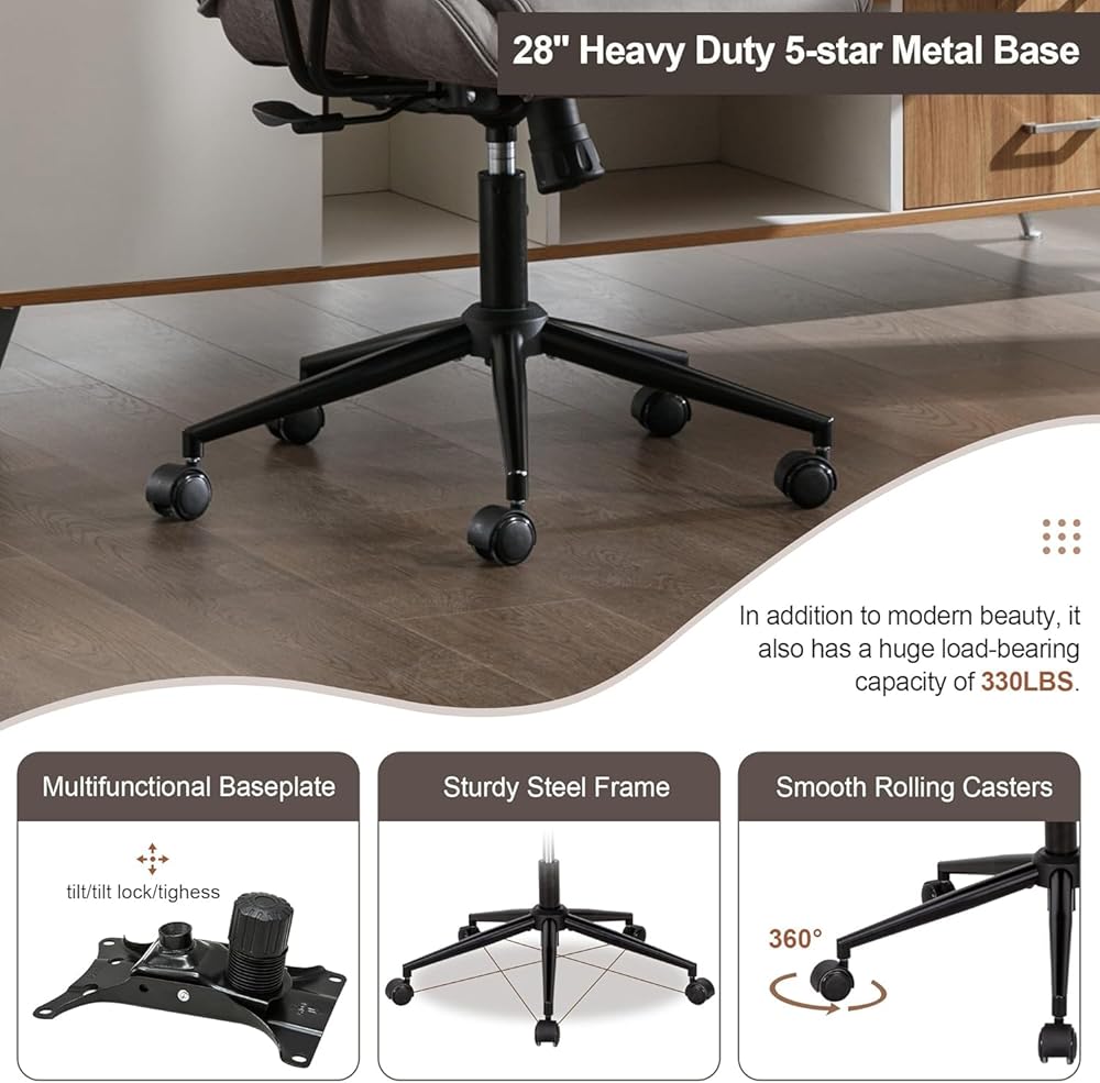 【هيكل ثابت ومتين - سعة 330 رطلاً】 تم تصميم الكرسي التنفيذي Okeysen بقاعدة شديدة التحمل وعجلات دوارة ناعمة بزاوية 360 درجة، ويدعم ما يصل إلى 330 رطلاً. يضمن رفع الغاز المعزز والهيكل المعدني استقرارًا طويل الأمد وحركة سلسة.