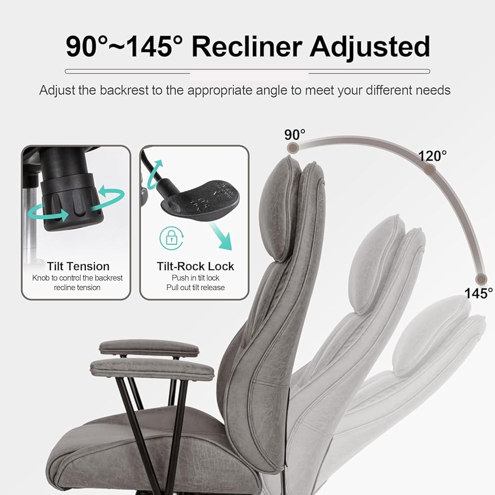 【وظيفة الارتفاع والاستلقاء القابلة للتعديل】 قم بتخصيص مستوى راحتك بسهولة من خلال ارتفاع المقعد القابل للتعديل ومسند الظهر القابل للإمالة الذي يميل من 90 درجة إلى 145 درجة. قم بالتبديل بحرية بين وضعية العمل المستقيمة والاستلقاء المريح للقراءة أو الراحة.