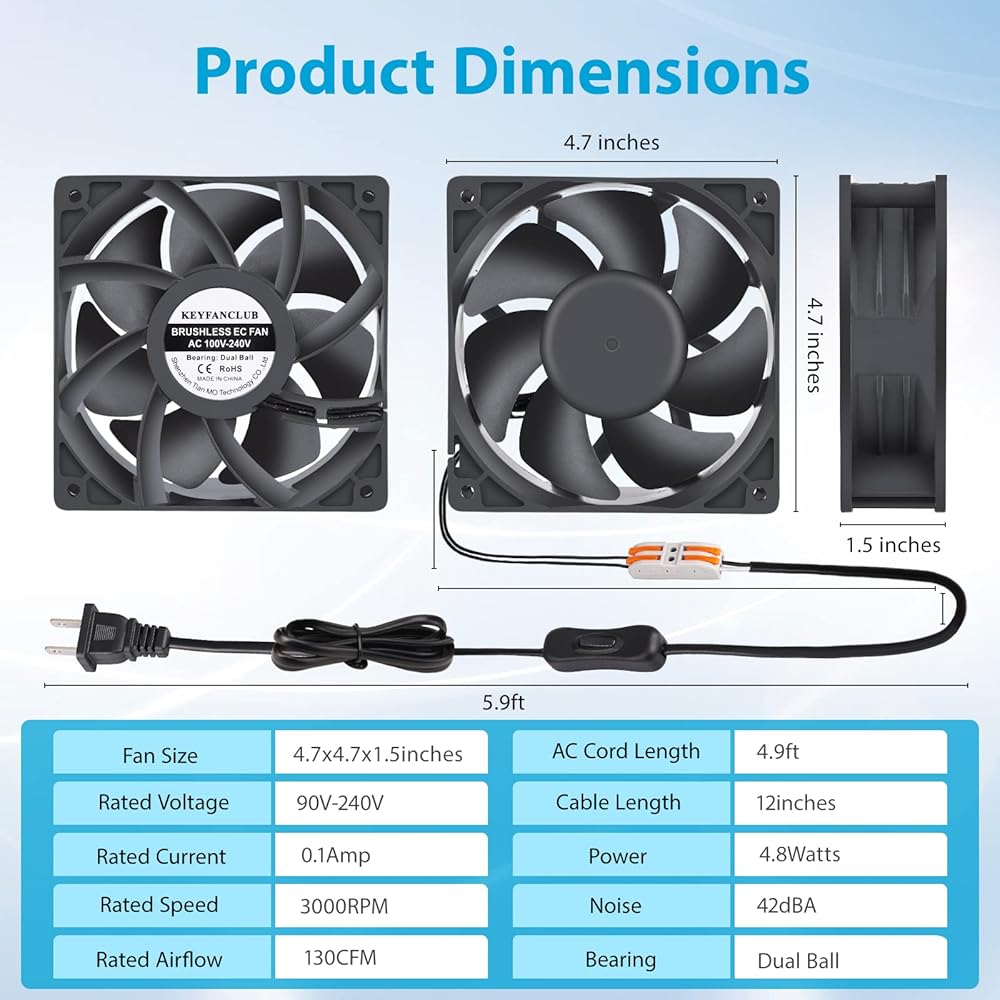 أبعاد مروحة تدفق الهواء العالي: 4.7×4.7×1.5 انش، الجهد: 12 فولت، التيار: 1.8 أمبير، الموصل: 4 دبابيس، السرعة: 5000 دورة في الدقيقة، تدفق الهواء: 215CFM، الضوضاء: 55 ديسيبل