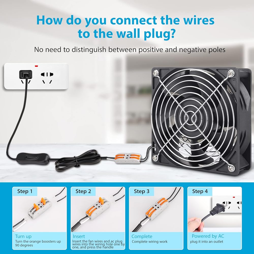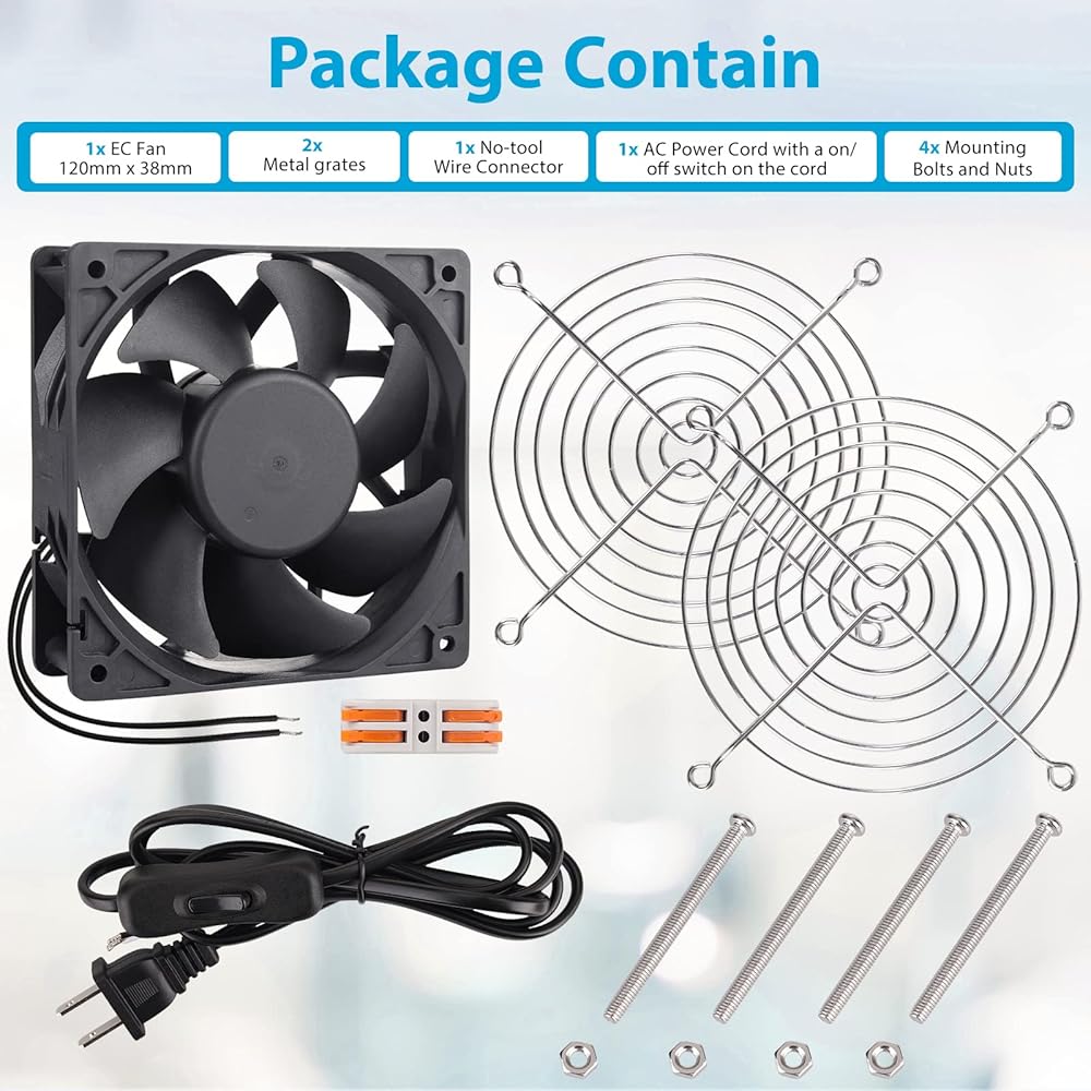 ما ستحصل عليه مجموعة مروحة التبريد: تأتي مروحة عالية السرعة 120 ملم مع براغي وشوايات مروحة وكابل تمديد بي دبليو ام. ملاحظة: تأكد من استخدام شبكة المروحة السلكية المرفقة لأن هذه المروحة قوية وستقطع أصابعك بشدة إذا لمست الشفرات. تأكد من الطاقة قبل الاستخدام..يرجى ملاحظة: هذه المروحة تحرك الكثير من الهواء، والضوضاء المقابلة عالية أيضًا. لا يُنصح به لجهاز الكمبيوتر الخاص بك. يوصى باستخدامه في المنطقة التي لا تمثل فيها الضوضاء مشكلة، وتدفق الهواء في حالة ممتازة.