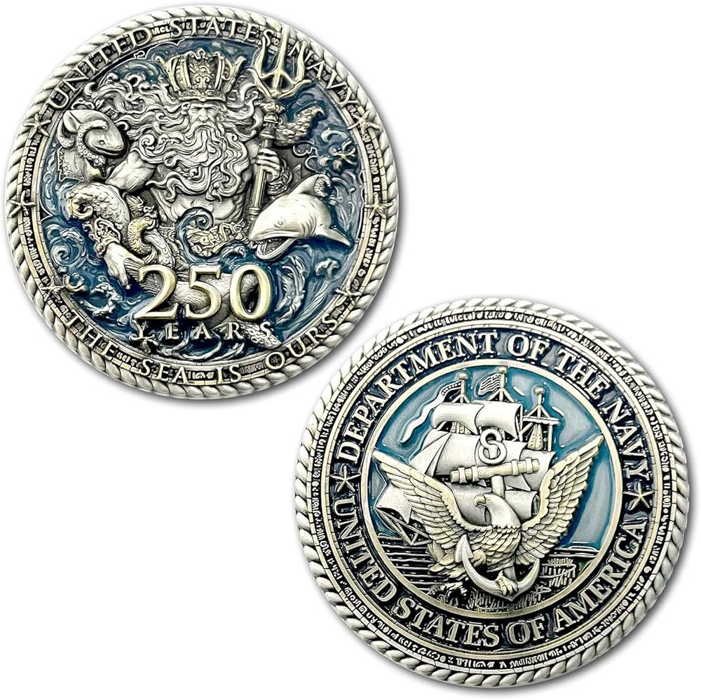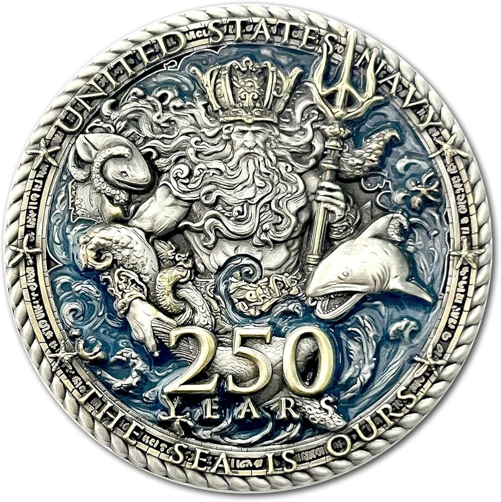 US Navy 250th Anniversary Birthday King Neptune Veteran Limited Edition Collectible Challenge Coin Celebrate 250 years of naval strength, honor, and tradition with this exclusive US Navy Birthday Commemorative Coin. Strikingly designed, the coin features King Neptune, the legendary ruler of the seas, wielding his mighty trident of power as he rises from the ocean depths. Surrounded by aquatic life in vivid detail, the design pays tribute to the eternal bond between the Navy and the sea. Crafted with precision and designed with original artwork, this coin honors the sailors who have defended America's freedom on every ocean since 1775. The reverse proudly displays the official commemoration of the 250th US Navy Birthday, a milestone celebrating courage, sacrifice, and unwavering service. 2-inch diameter premium challenge coin Intricate 3D relief of King Neptune and oceanic elements Striking gold and silver finishes with vivid enamel accents Commemorates the 250th Anniversary of the US Navy (1775–2025) A must-have collectible for sailors, veterans, and Navy families Carry the spirit of the sea, the might of Neptune, and the proud legacy of the United States Navy with this one-of-a-kind commemorative coin. 2" diameter 4 mm thick Antigue Gold and Silver Plating Hand painted Ink