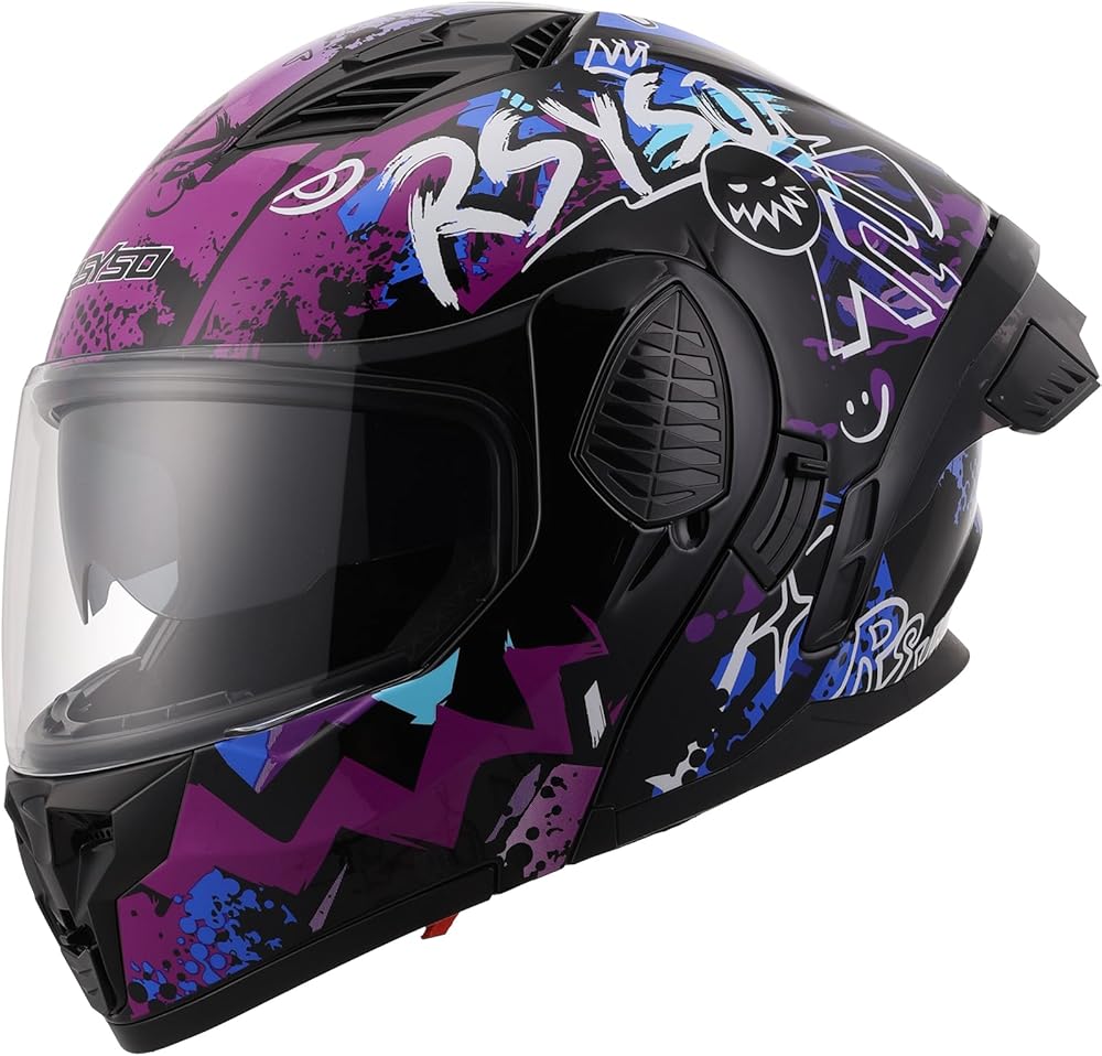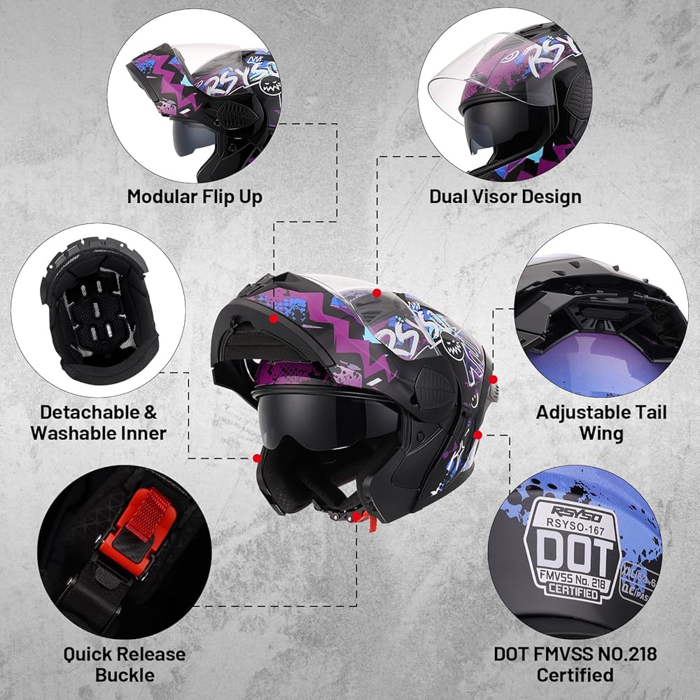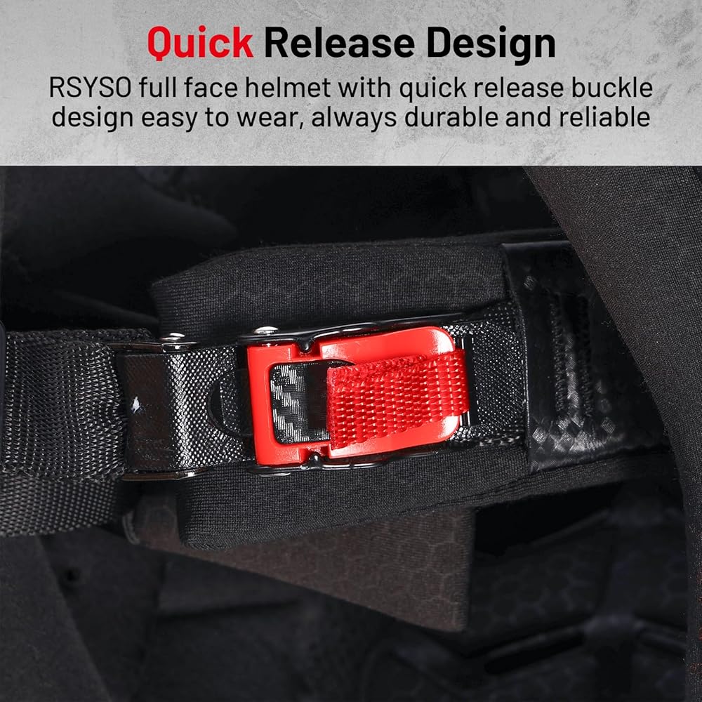 Outstanding Safety Features - RSYSO modular face helmet made with high-strength ABS shell and multi-density EPS lining, equipped with high-strength quick-release buckles, compliant with DOT FMVSS218 safety standards