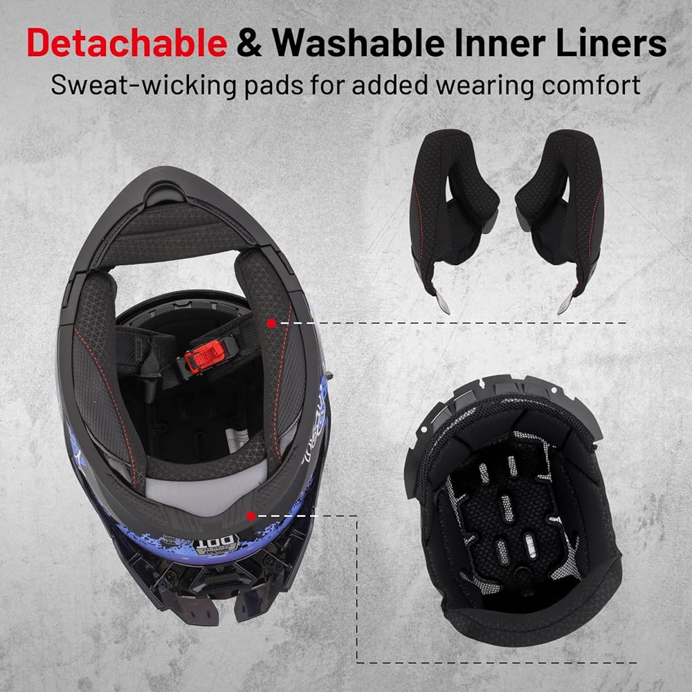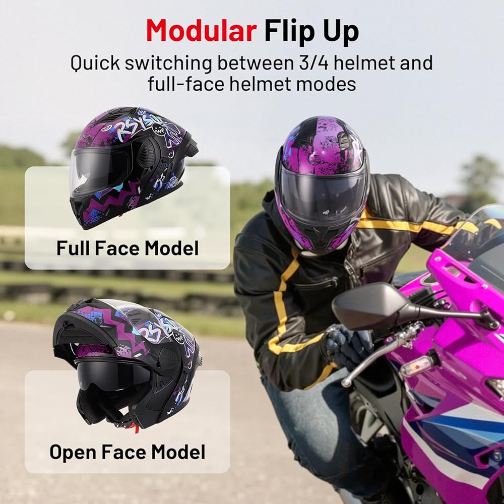 Flip-up modular design - The RSYSO full-face helmet features a flip-up modular design, allowing quick switching between 3/4 helmet and full-face helmet forms. Meanwhile, the dual lens design adapts to riding needs in various scenarios