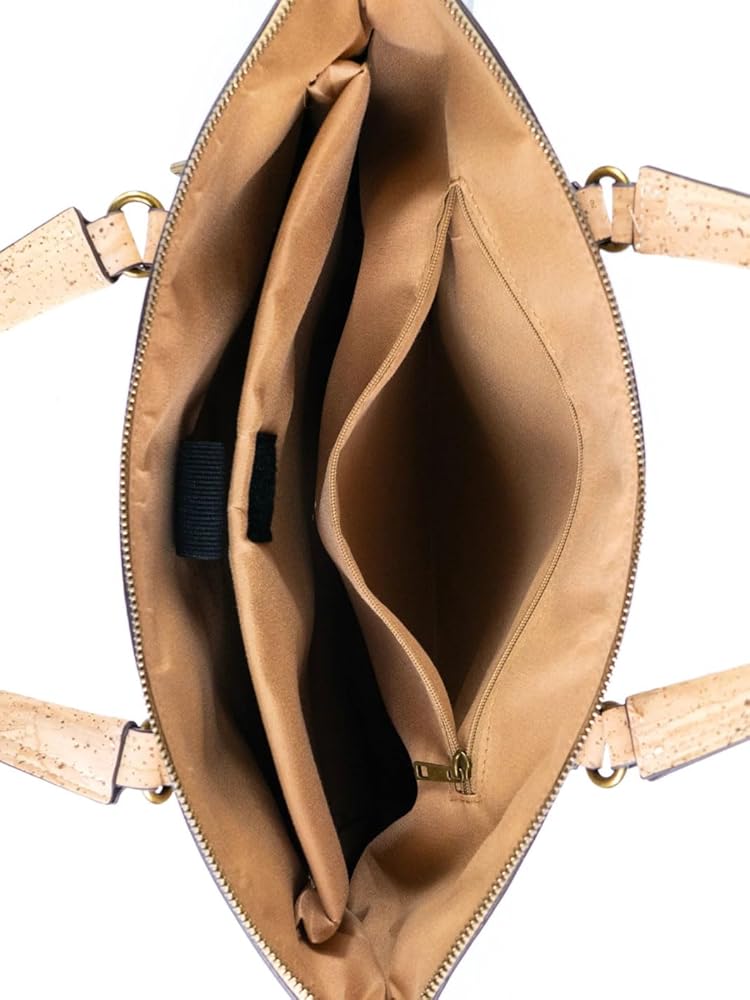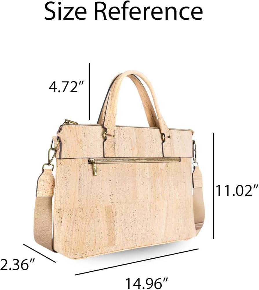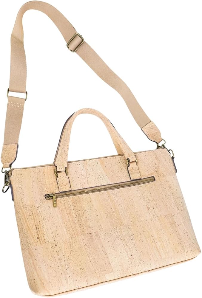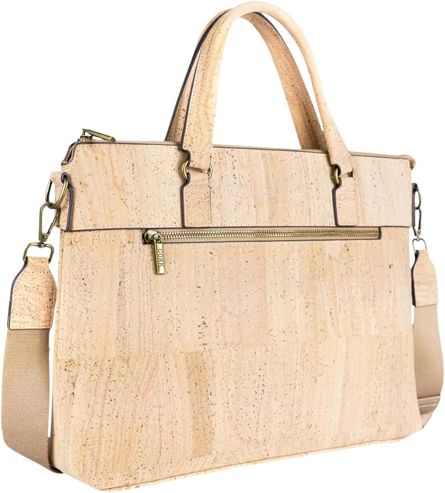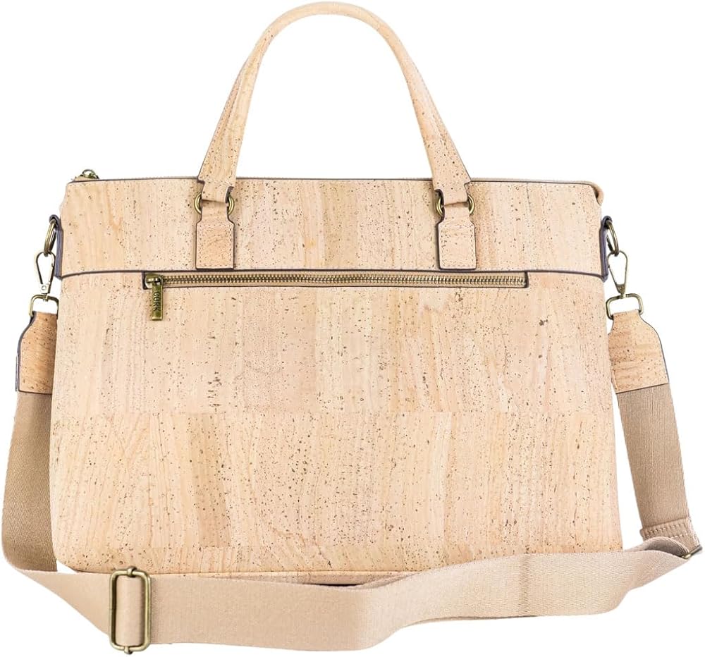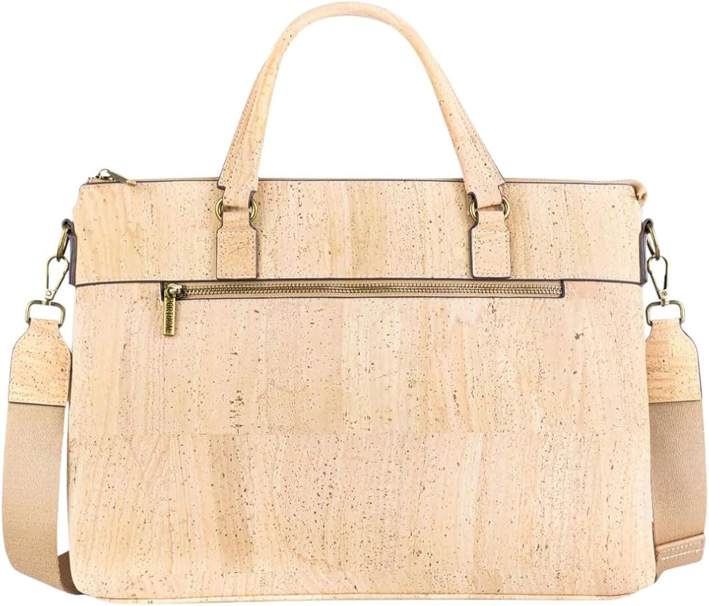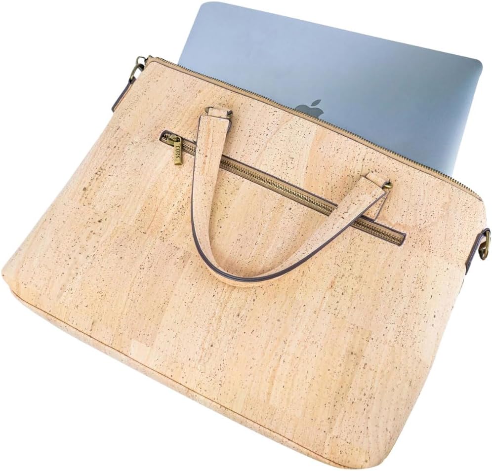 Elevate your professional style with this sophisticated Portuguese cork laptop bag. Crafted from natural cork material, this versatile bag combines classic design with modern functionality. The spacious interior features a padded compartment that securely fits laptops up to 15.6 inches, while multiple organizer pockets keep your accessories and documents neatly arranged. A convenient front zipper pocket provides quick access to frequently used items. The bag's thoughtful design includes both sturdy top handles and an adjustable, detachable shoulder strap for comfortable carrying options. Measuring 14.96 x 11.02 x 2.36 inches, this bag offers ample space without being bulky. The natural cork material is water-resistant and durable, making it perfect for daily use. The antique bronze hardware adds a refined touch to the overall aesthetic. Whether you're heading to the office, a business meeting, or traveling, this Portuguese cork laptop bag delivers both style and functionality. The neutral beige tone complements any professional wardrobe while showcasing the unique natural patterns of cork.