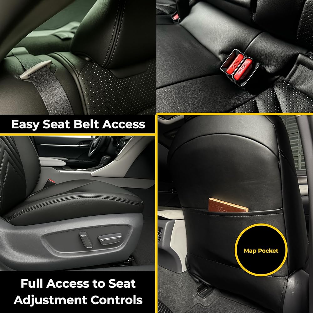 تخزين محسّن مع جيب الخريطة: تتميز بجيب خريطة مريح في الجزء الخلفي من المقاعد الأمامية، وتضيف أغطية المقاعد لدينا مساحة تخزين إضافية لضرورياتك، مما يحافظ على سيارتك منظمة وخالية من الفوضى أثناء السير على الطريق.