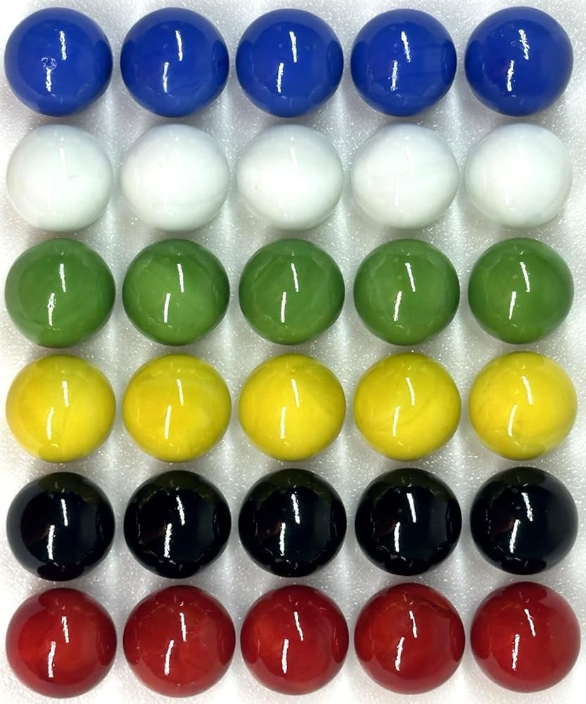 Complete set of 30 Solid glass Replacement Marbles for Chinese Checkers, Aggravation, Dirty Marbles, or Wahoo Game. 6 colors, 5 of each Red, Blue, Green, Black, White, Yellow. Brand new 3/4" (19mm) **Chinese Checker Games will need 2 sets!!** LIFETIME WARRANTY CERTIFICATE included.