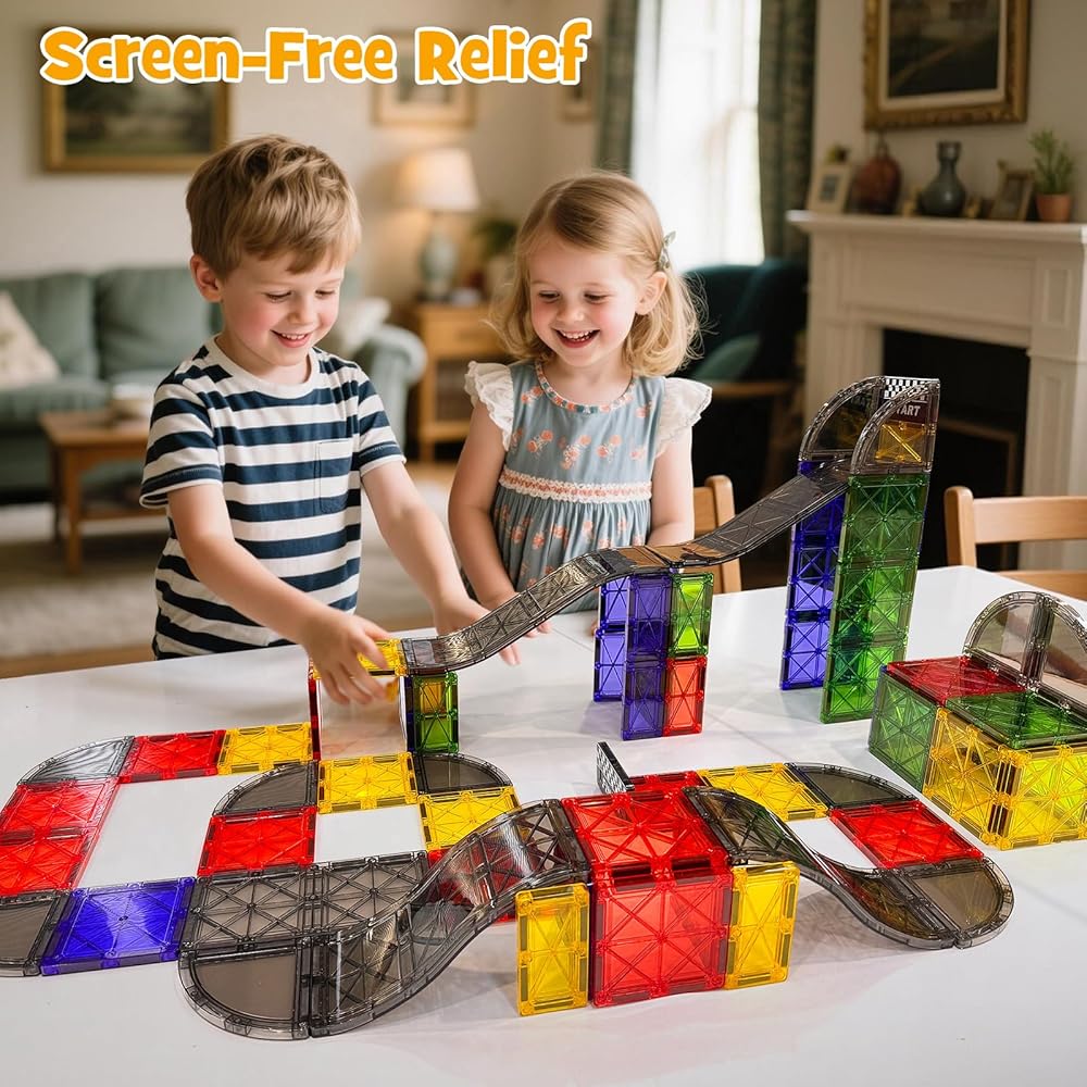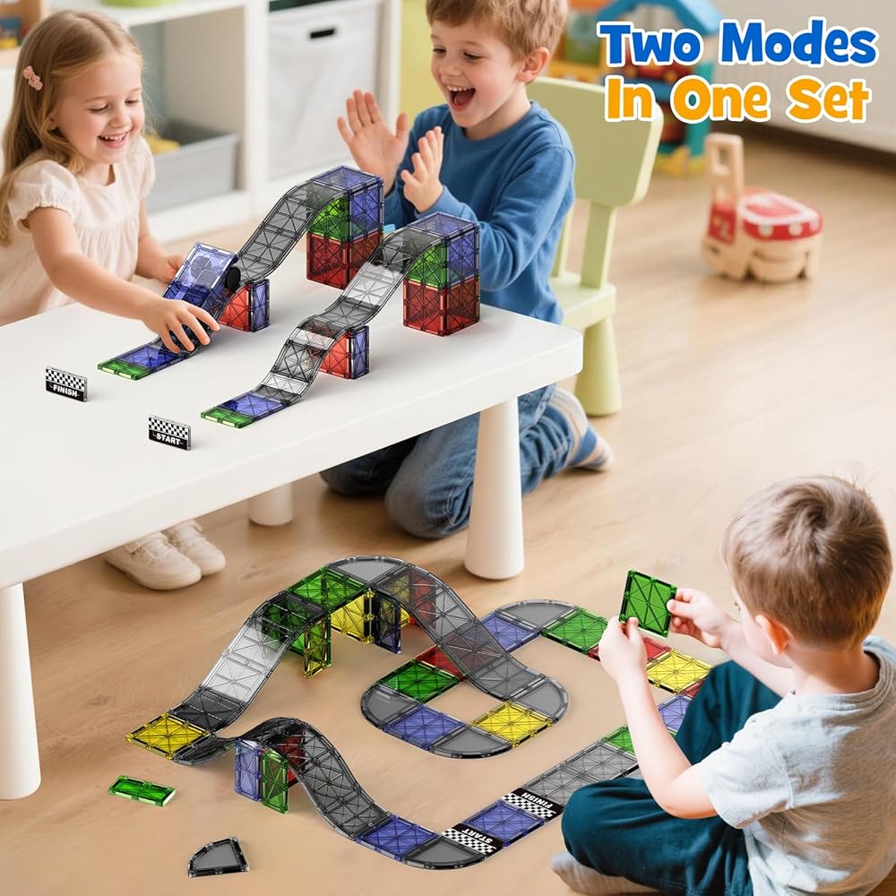 【تصميم آمن فائق الثبات ومتين】مصنوع بتقنية اللحام بالموجات فوق الصوتية لمتانة استثنائية تقاوم الكسر، حتى خلال ساعات من اللعب القاسي. تتم إضافة مغناطيسات إضافية إلى جوانب البلاط المنحدرة، وعندما تقترن بالبلاط المغناطيسي المستطيل/المربع المقوى، يظل الهيكل صلبًا - لا ينزلق أو ينهار، حتى بعد تكرار سباقات السيارات عالية السرعة إلى خط النهاية