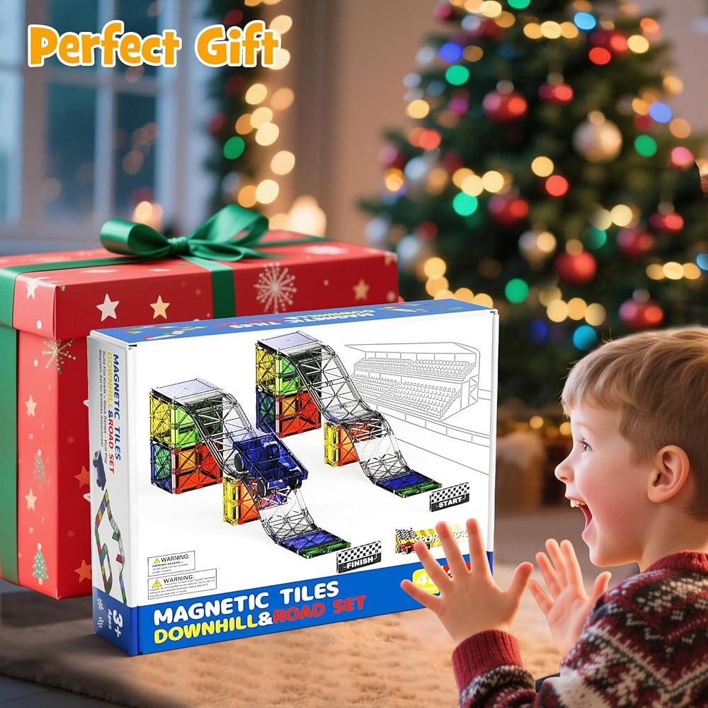 مجموعة بلاط مغناطيسي 2 في 1 للانحدار والطرق - 40 قطعة من مكعبات البناء المغناطيسية مع السيارة، ألعاب مونتيسوري لمرحلة ما قبل المدرسة للأولاد والبنات بعمر 3 سنوات فما فوق، ألعاب حسية مثالية للأطفال الصغار
