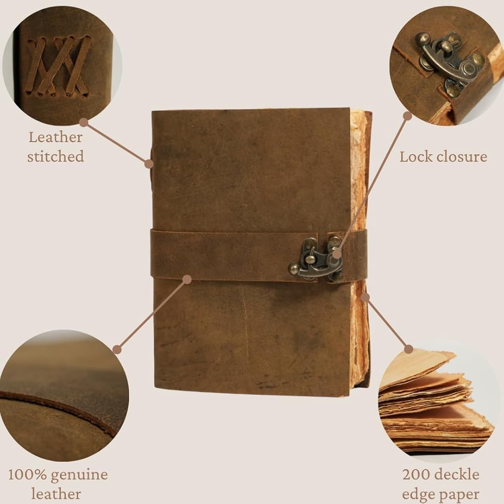 ✅ قفل عتيق آمن وإغلاق ملتف - حافظ على ملاحظاتك ورسوماتك وأسرارك آمنة مع القفل النحاسي العتيق وإغلاق الحزام. تضمن هذه المجلة الجلدية القابلة للقفل حماية أفكارك الخاصة وبقاء صفحاتك سليمة. يضيف الحزام الملتف أيضًا لمسة كلاسيكية مع توفير الوظائف. سواء تم استخدامه كمذكرات سفر، أو مجلة أحلام، أو دفتر ملاحظات شخصي، فإنه يجعله رفيقًا جميلاً وآمنًا في أي رحلة أو مسعى إبداعي.