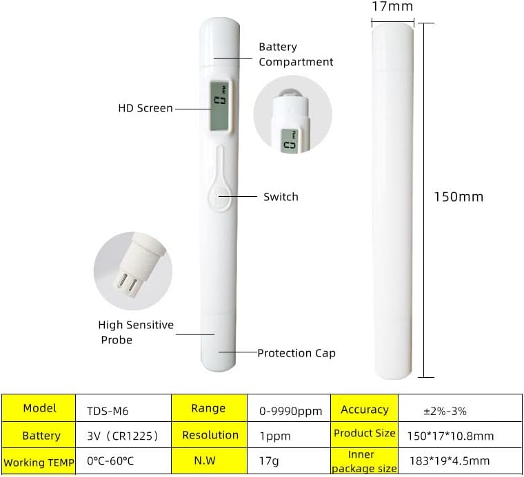 • Light and Portable:The digital water tester size is similar to the eyebrow pencil, and the weight is 26g;TDS meter equipped with energy-saving chips and automatic power-off function, it has a long battery life, allowing you to test your drinking water anytime, anywhere