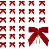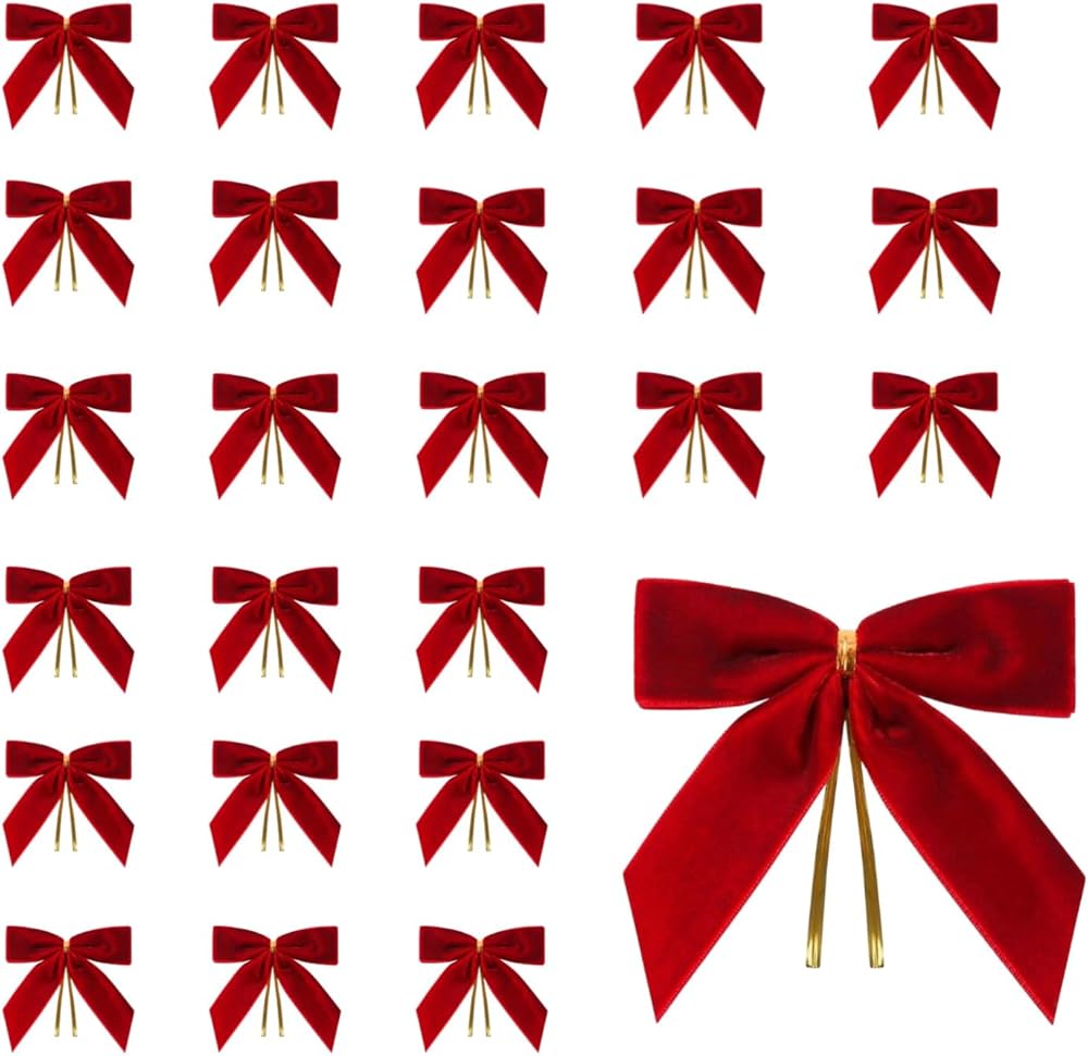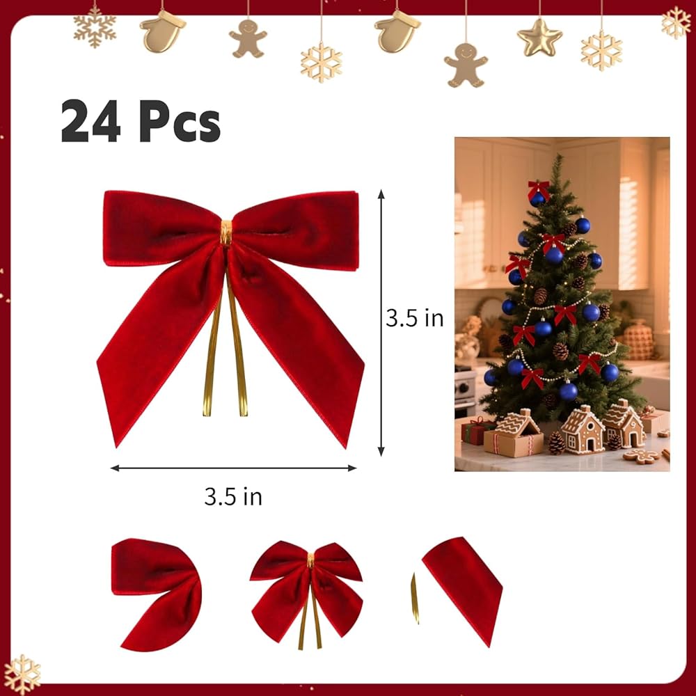 24 قطعة من الأقواس المخملية الحمراء مقاس 3.5 بوصة لشجرة عيد الميلاد مع أربطة ذهبية ملتوية، وأقواس صغيرة مصنوعة مسبقًا للشجرة، وأكاليل الزهور، وتغليف الهدايا، والسلال، وحفلات الزفاف، والاستحمام، والحرف اليدوية للعطلات (أحمر)