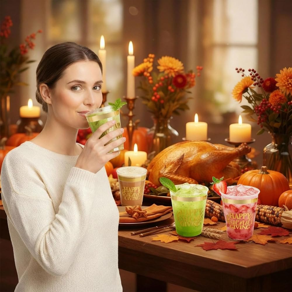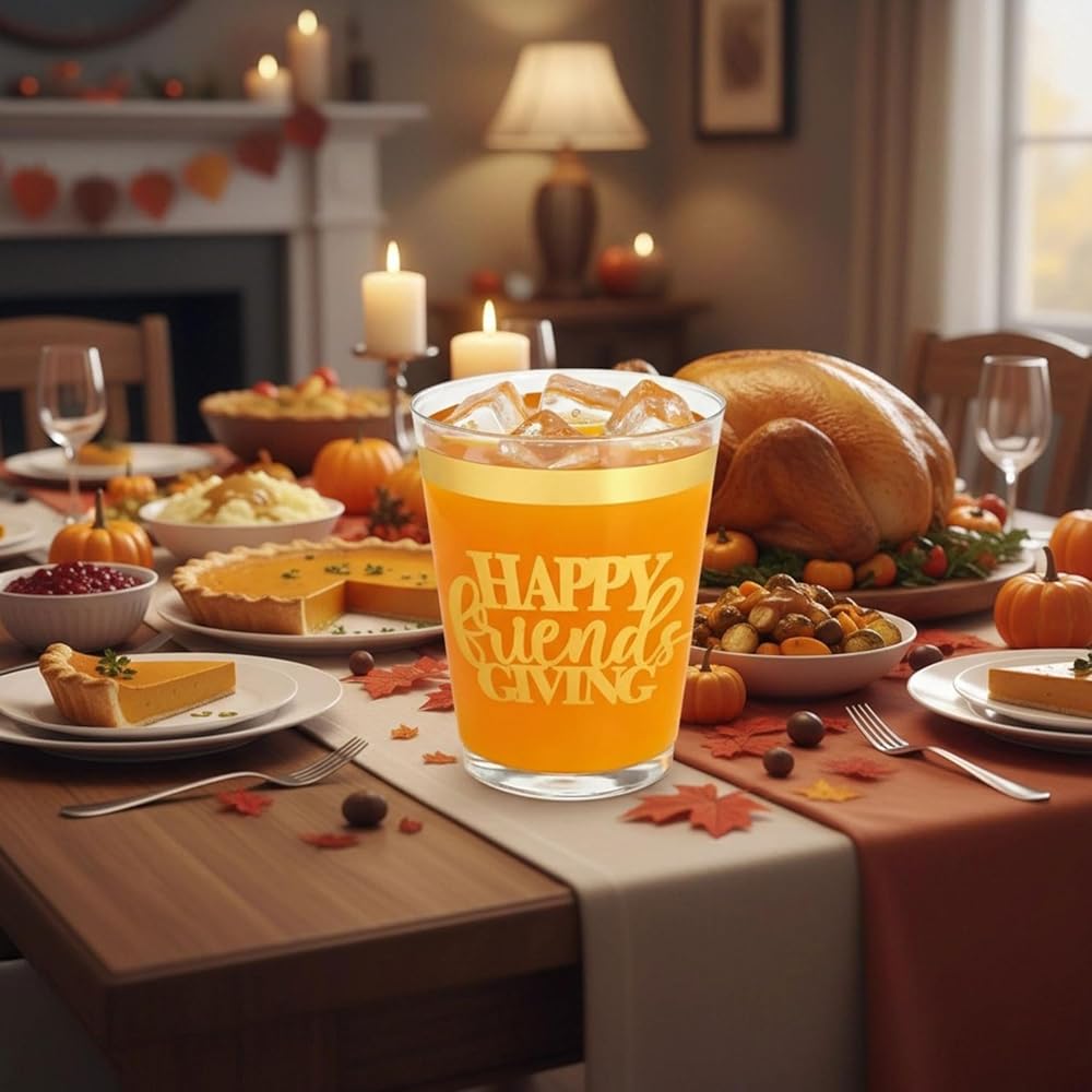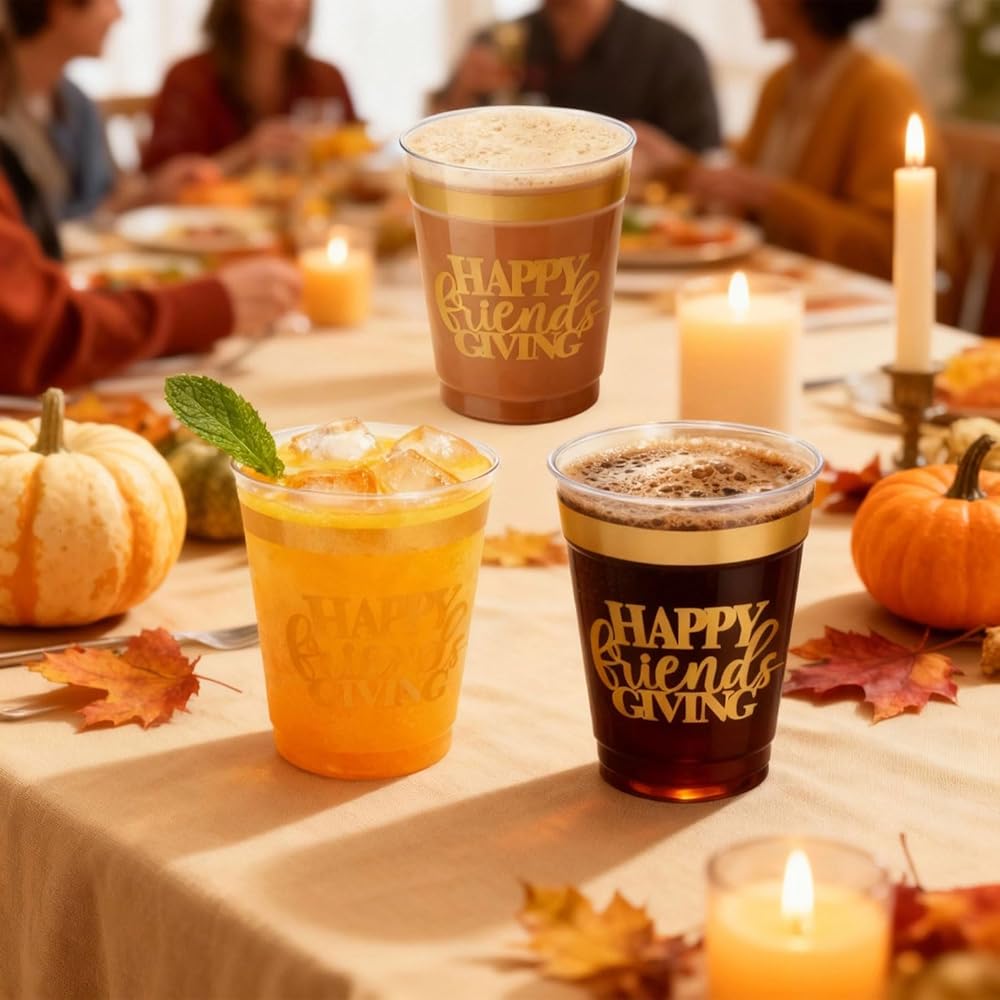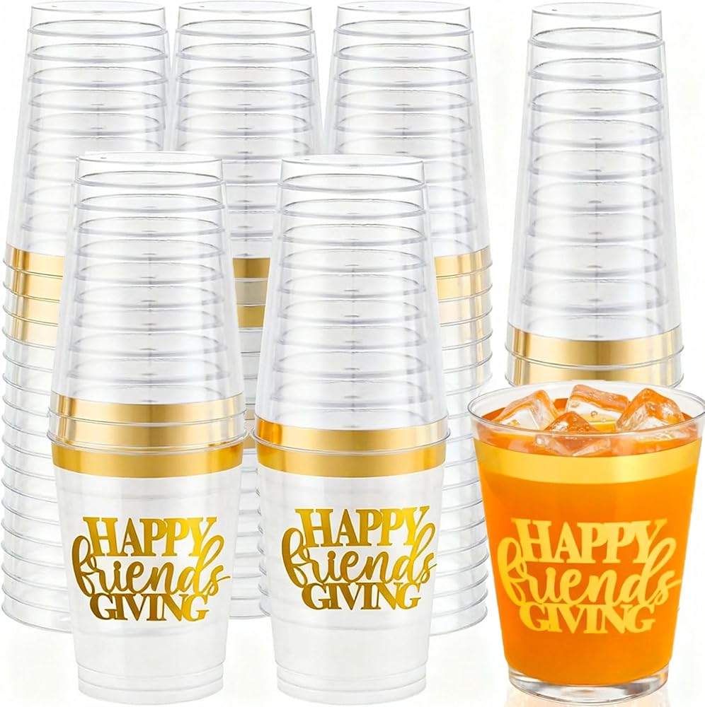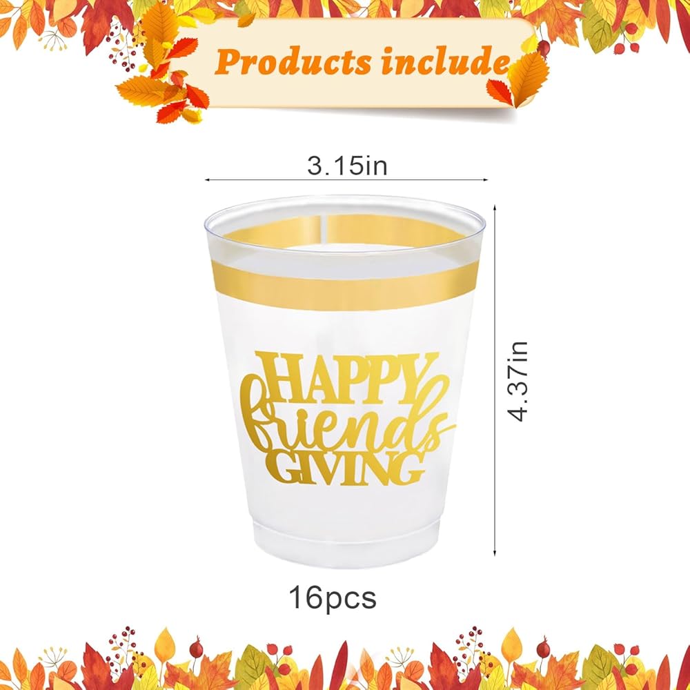 16 عبوة من أكواب عيد الأصدقاء السعيدة لتزيين حفلات عيد الشكر، 12 أونصة من رقائق الذهب البلاستيكية الشفافة القابلة لإعادة الاستخدام لمستلزمات حفلات عيد الشكر