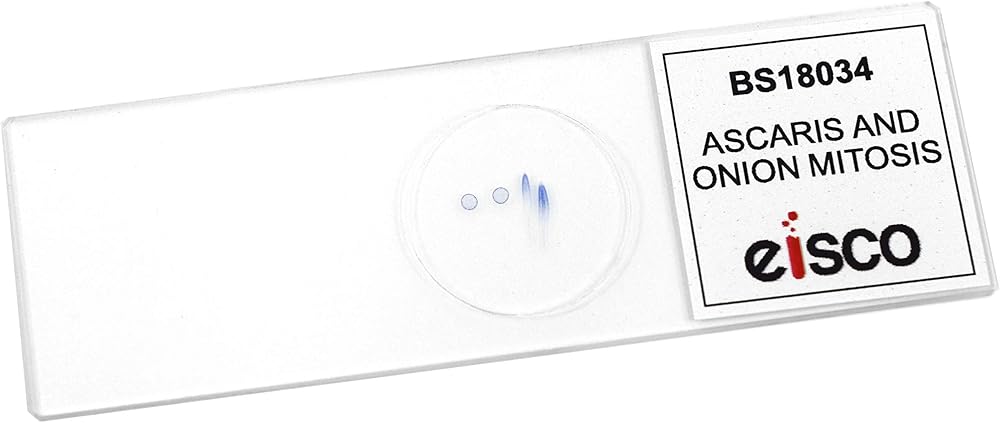 شريحة مجهرية مفردة معدة مع انقسام الإسكاريس والبصل (الآليوم). يبين كل مرحلة من مراحل انقسام الخلايا الانقسامية في الكائنات الحية الحيوانية والنباتية. مثالية لدراسة الاختلافات بين الانقسام النباتي والحيواني. يصل في غلاف من الورق المقوى الواقي. يبلغ عرض الشريحة 75 مم (3 بوصات) وطولها 25 مم (1 بوصة) وارتفاعها 0.06 بوصة.