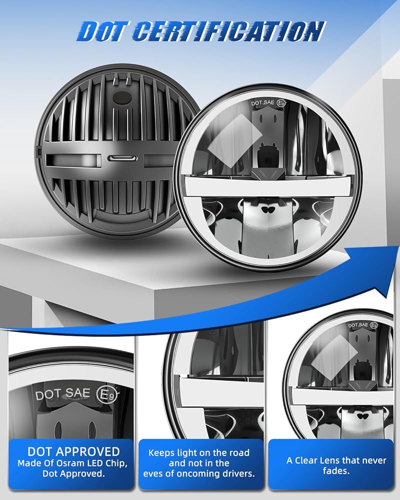 【شهادة معتمدة】تم اعتماد المصباح الأمامي Jumpdy مقاس 5.75 بوصة من قبل وزارة النقل الأمريكية (DOT) لتلبية معايير السلامة على الطرق. يضمن ختم الاعتماد الرسمي هذا التثبيت القانوني والموثوق على مجموعة واسعة من المركبات، بدءًا من سيارات العضلات الكلاسيكية وحتى الشاحنات الحديثة، مما يضمن راحة البال.