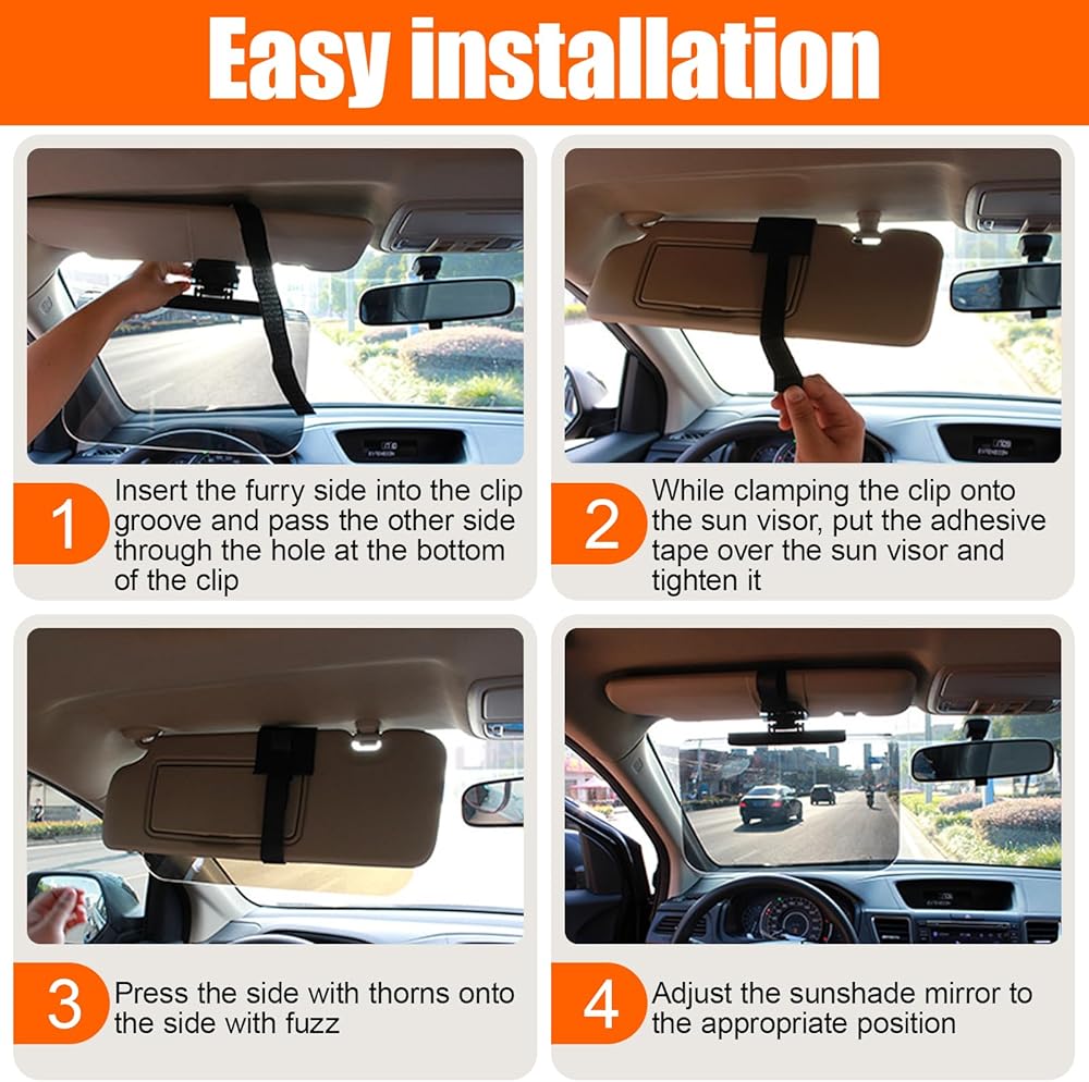 • 【Easy to Install】:This car sun visor extender comes with a clip and magic tape for easy installation. 1. Put one side of the magic tape into the groove of the clip, pass the other side through the hole at the bottom of the clip, and then adjust the tape to the appropriate position. 2. Clip the clip to the sun visor and put the tape on the sun visor, then tighten it. 3. Stick the magic tape on both sides and adjust the sun visor to the appropriate position. After installation, it is very stable and can tightly fit with your car's original sun visor, without easily sliding.