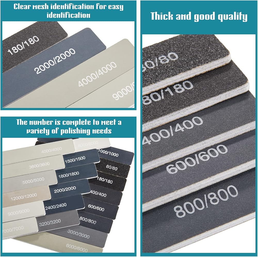 معلومات العبوة: تحتوي العبوة على 20 قطعة من عصي التلميع في 20 حبيبة مختلفة، بما في ذلك 80، 180، 400، 600، 800، 1000، 1500، 1800، 2000، 2400، 3000، 3200، 3600، 4000، 5000، 6000 , 70000 8000، 9000، 12000؛ الكمية الكافية يمكن أن تلبي بسهولة احتياجات الاستخدام اليومي والاستبدال