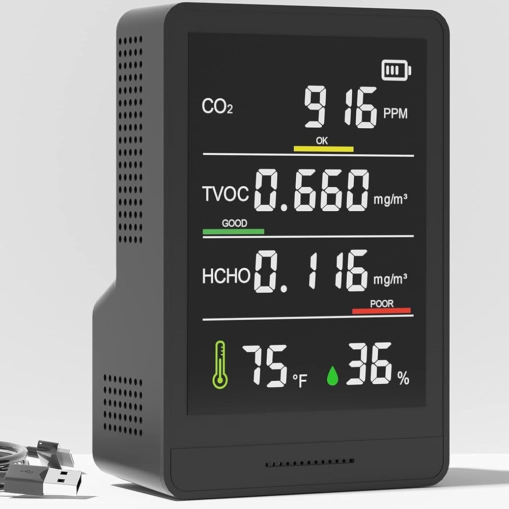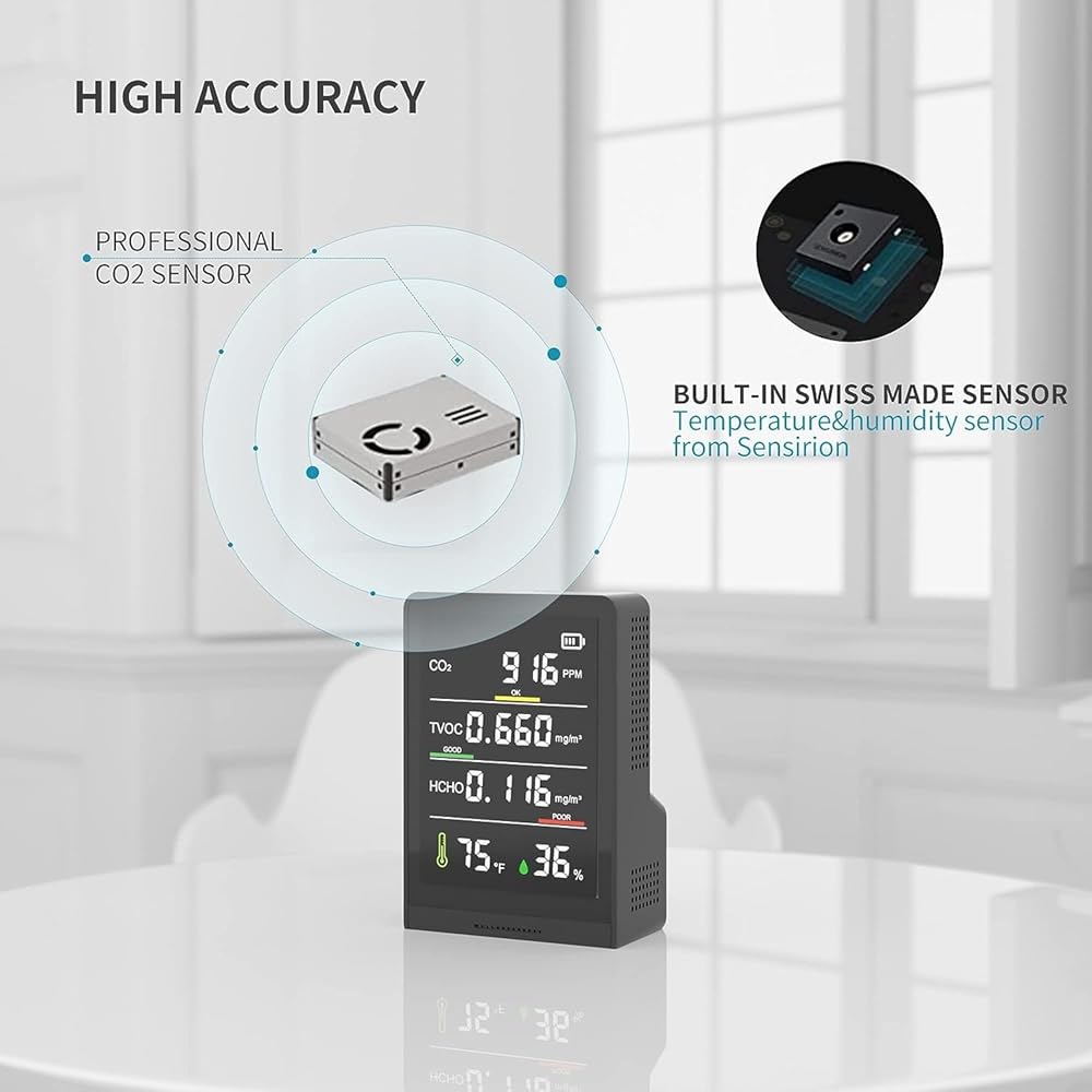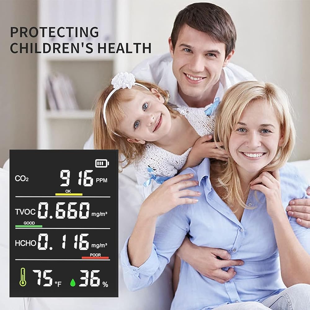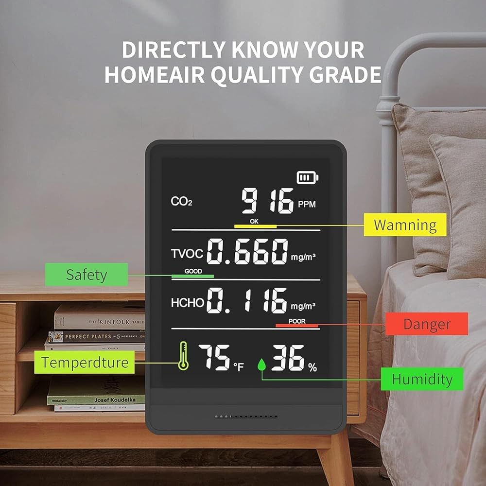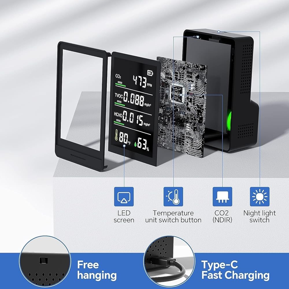 【احم كل أنفاسك】 نظرًا لأن الهواء النظيف يعني الكثير لكل شخص، فإن جهاز مراقبة جودة الهواء 5 في 1 سيكون خيارك الأفضل. يمكنه مراقبة ثاني أكسيد الكربون وTVOC وHCHO والرطوبة ودرجة الحرارة بدقة. يمكنك مراقبة البيئة في أي وقت.