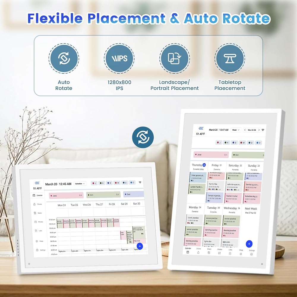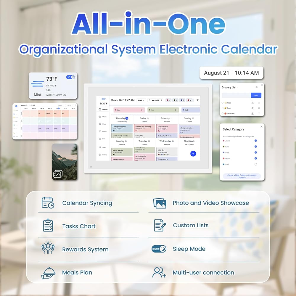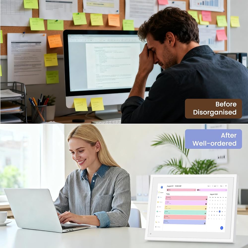 【قابلية للتكيف متعدد المشاهد】يتكيف تقويم شاشة اللمس بمرونة مع المطابخ وغرف الدراسة وغرف المعيشة. يندمج تصميم الإطار الأبيض بسلاسة مع البيئات المنزلية الحديثة.