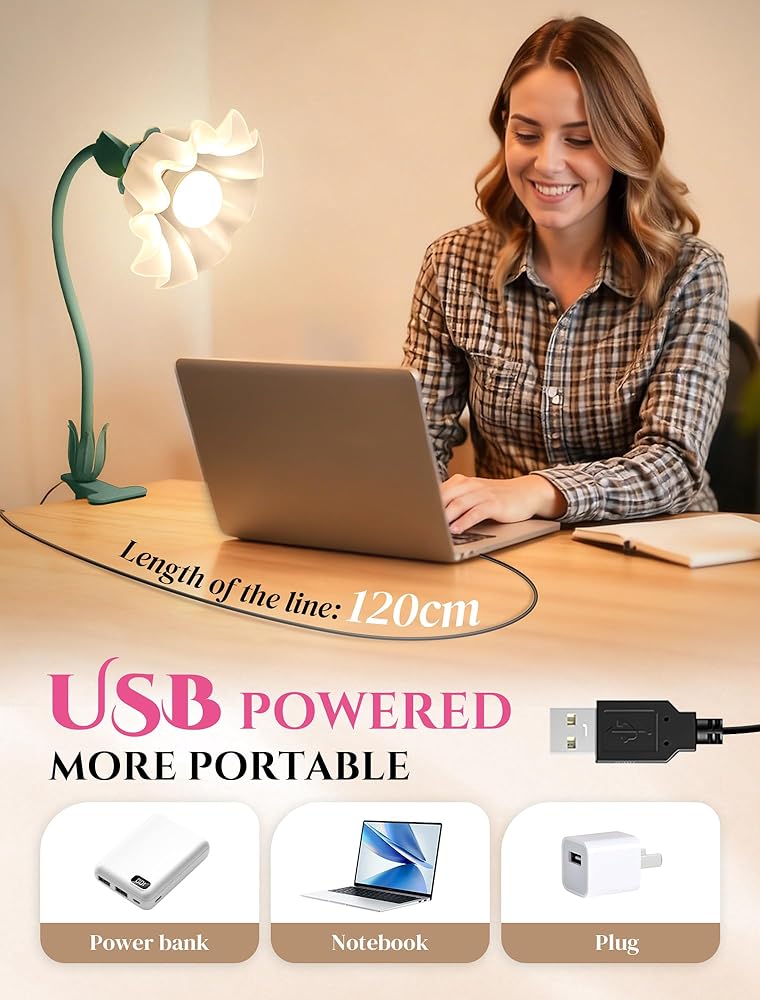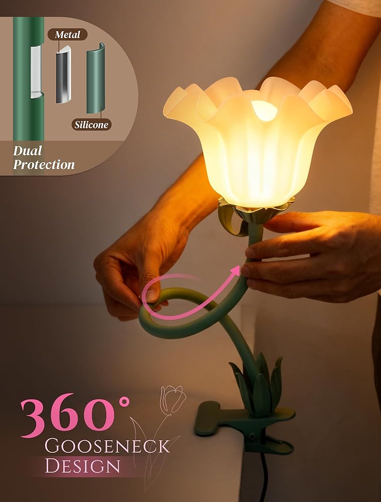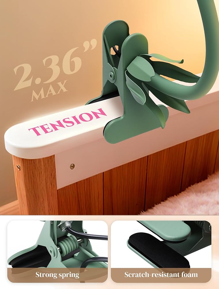 【عنق مرن ومشبك قوي】تحتوي مصابيح مكتب الزهور هذه للمكتب المنزلي على طول 16.54 بوصة من أنبوب عنق الإوزة المرن 360 درجة، ويمكن ضبط اتجاه الضوء والارتفاع والمسافة بسهولة. يمكن فتح المشبك القوي حتى 2.3 سم، وسهل التثبيت على الطاولات والسرير والألواح الأمامية