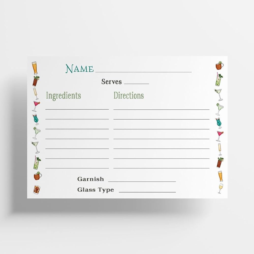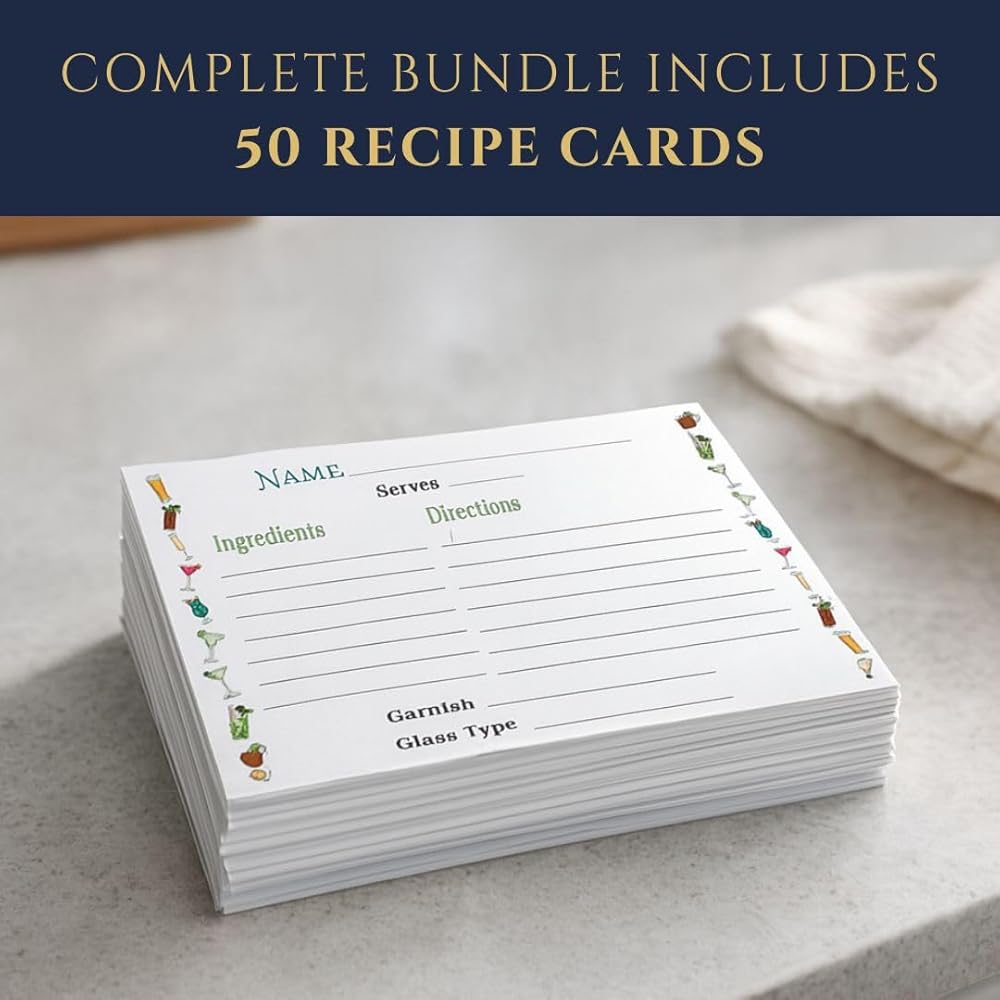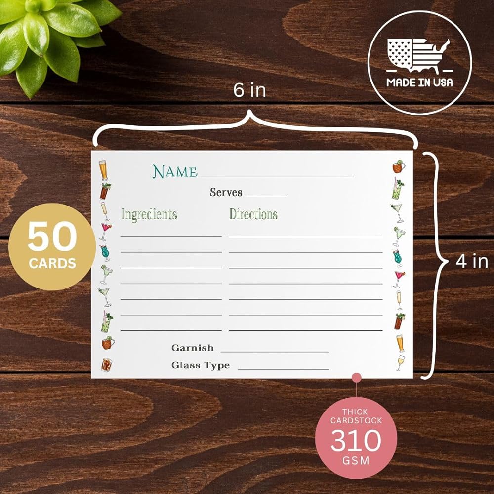 بطاقات وصفات الكوكتيل - 50 وحدة - 4 × 6 بوصات بطاقات ملء فارغة مع حدود مائية أنيقة - مخزون بطاقات ممتاز غير مطلي، يناسب صناديق الوصفات القياسية - صُنعت في الولايات المتحدة الأمريكية بواسطة شركة تديرها عائلة