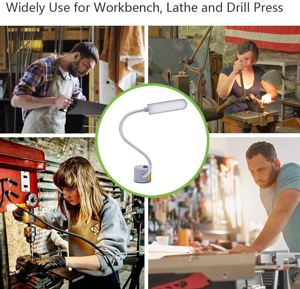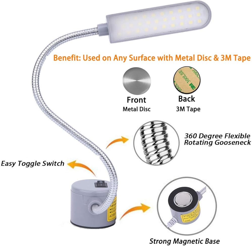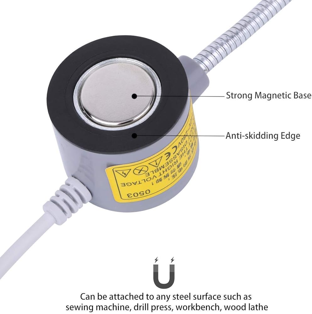 【قاعدة مغناطيسية قوية وتطبيق واسع】- يأتي هذا المصباح المغناطيسي بقاعدة مغناطيسية قوية، ويمكن ربطه بأي سطح معدني. المغناطيس القوي يمكن أن يجعله مستقرًا وآمنًا على الرغم من الاهتزاز والصدمات أثناء العمل. يمكن استخدام ضوء الخياطة LED هذا على نطاق واسع لمنضدة العمل والمخرطة ومكبس الحفر وآلة الطحن/الخياطة للعمل