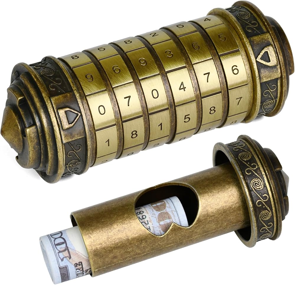 wellsee Da Vinci Code Mini Numbers Cryptex Brainteaser Puzzle Box، صندوق نقود معدني بقفل كلمة مرور مع حجرة مخفية للنقود، لعبة التحدي للأعمار من 12 عامًا فما فوق، هدايا عيد الميلاد الفريدة لها وله، برونزية