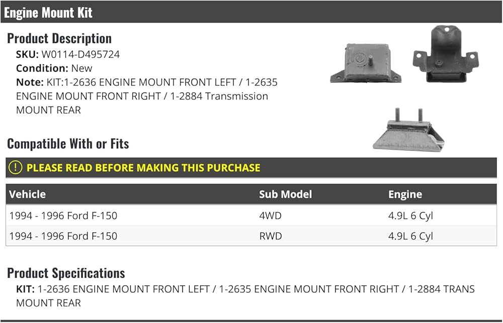 Engine Mount and Transmission Mount Kit - 3-Piece - Compatible with 1994 - 1996 Ford F-150 4WD, 2WD 4.9L 6-CylinderNote:Quality ReplacementKit Includes:(1) 2636 Front Left Driver Side Engine Mount; (1) 2635 Front Right Passenger Side Engine Mount; (1) 2884 Rear Transmission MountCompatible With or Fits:1994 - 1996 Ford F-150 4WD 4.9L 6 Cyl1994 - 1996 Ford F-150 RWD 4.9L 6 Cyl