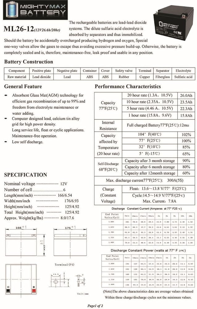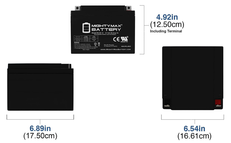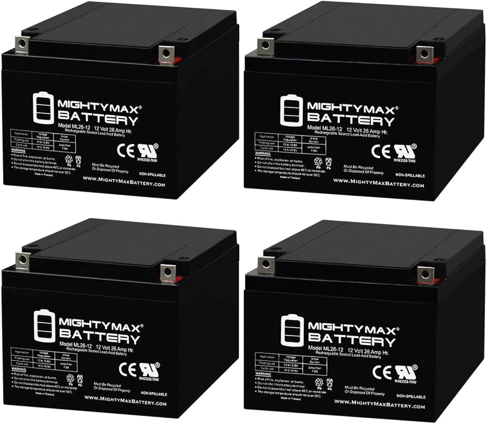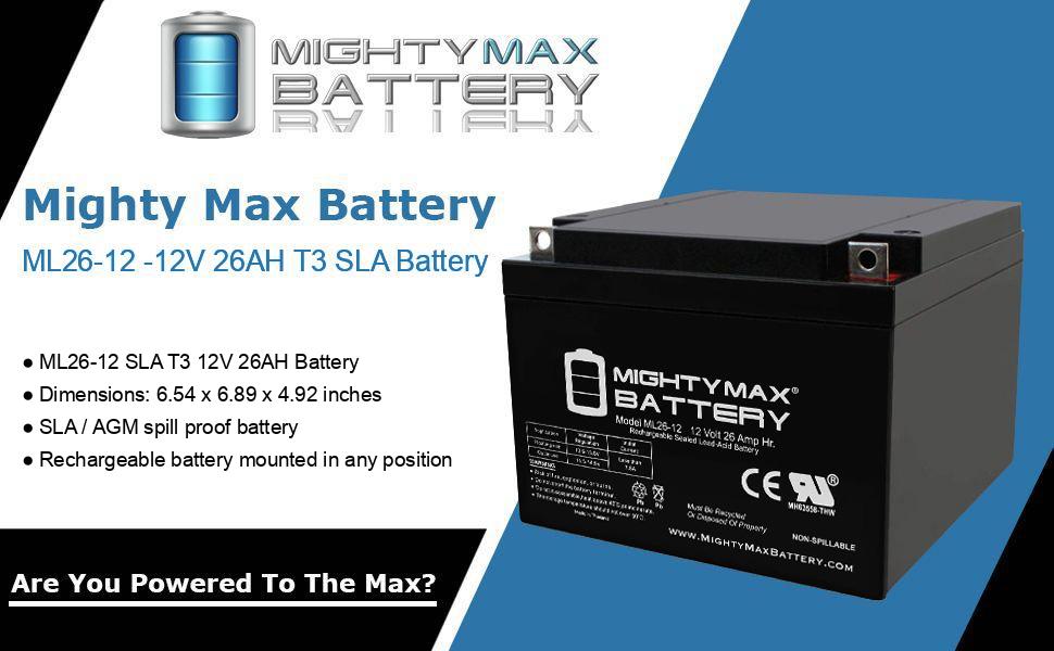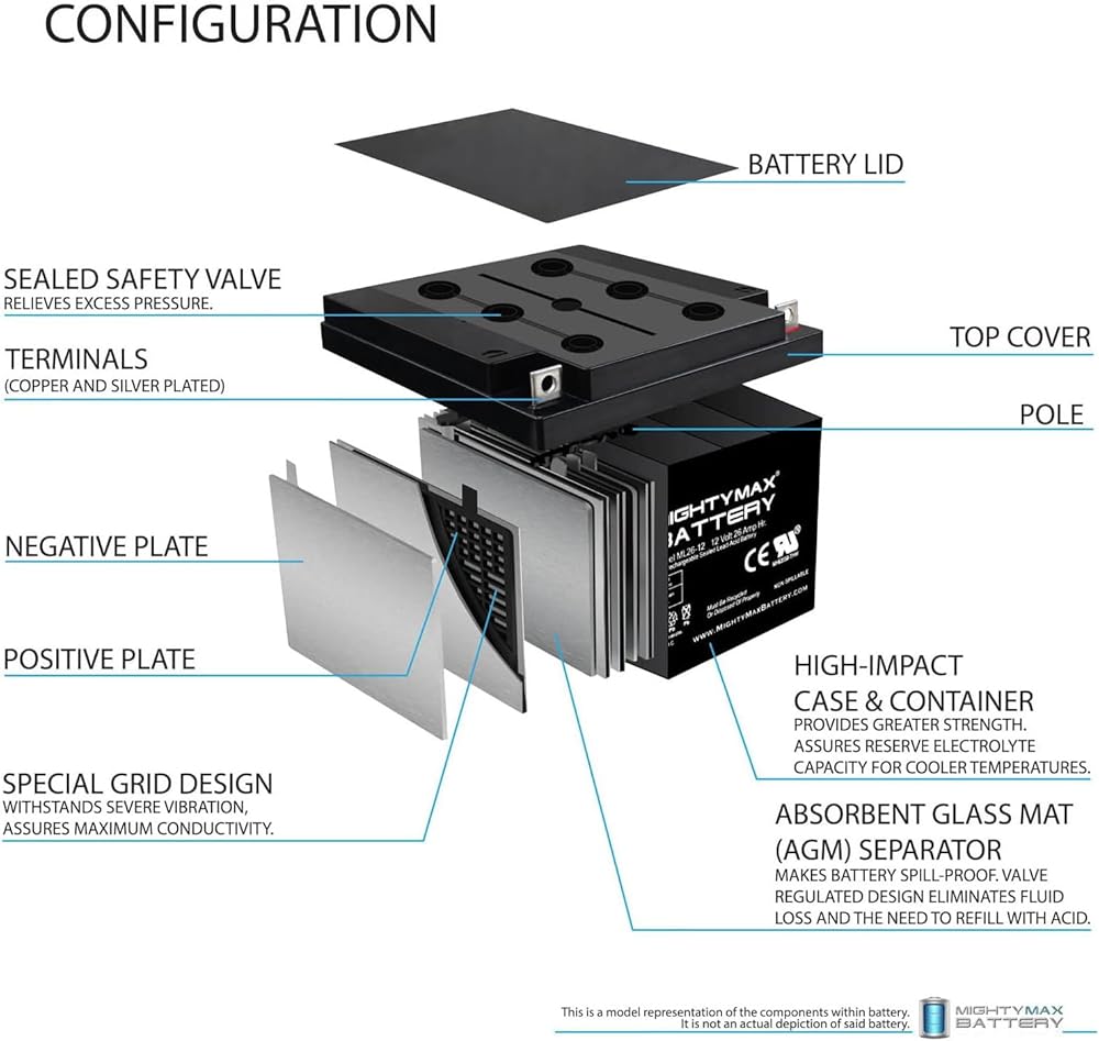 • ML26-12 SLA عبارة عن بطارية حمض الرصاص المختومة (SLA) بقدرة 12 فولت 26 أمبير قابلة لإعادة الشحن ولا تحتاج إلى صيانة، عبوة من قطعتين - معتمدة من UL