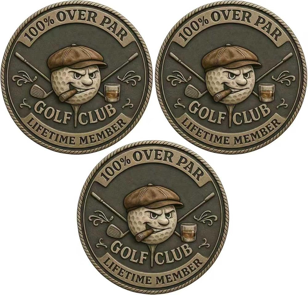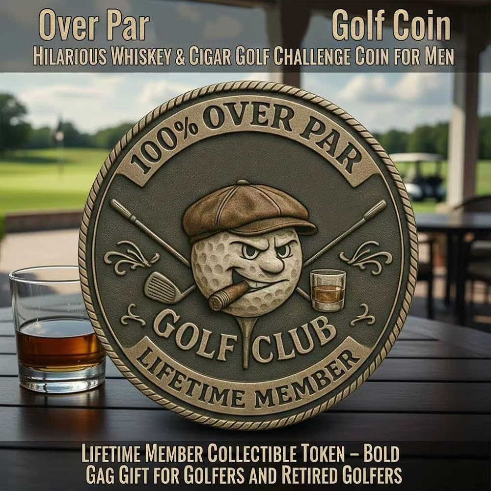 Humorous Design: The "Over Par Old " Golf Coin features a uniquely designed metal piece that showcases a gruff golf ball complete with a cigar and whiskey, making it the perfect funny golf coin.