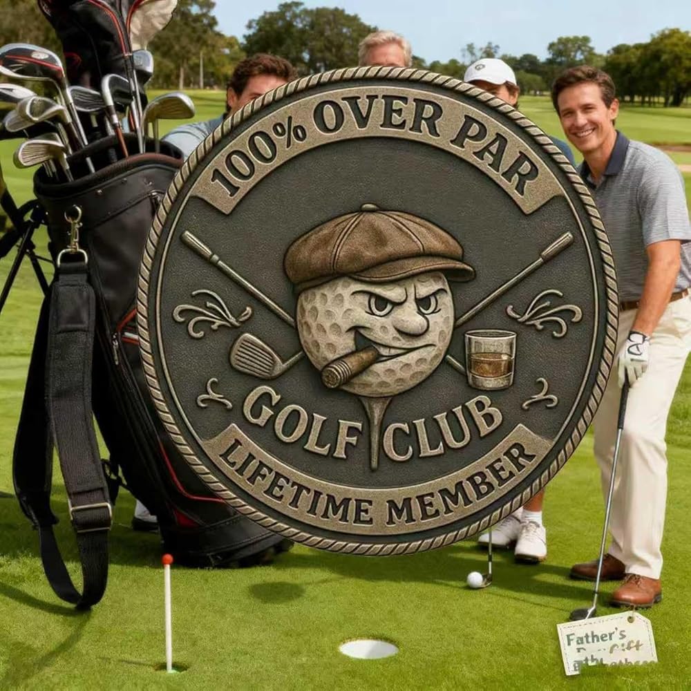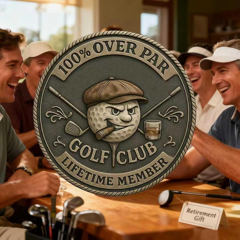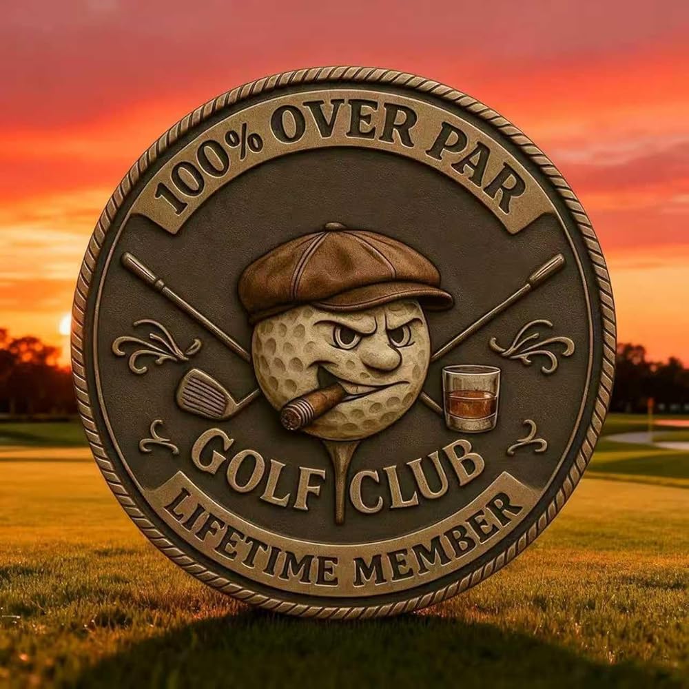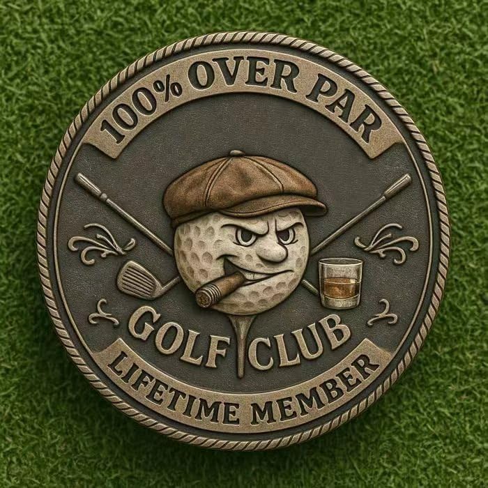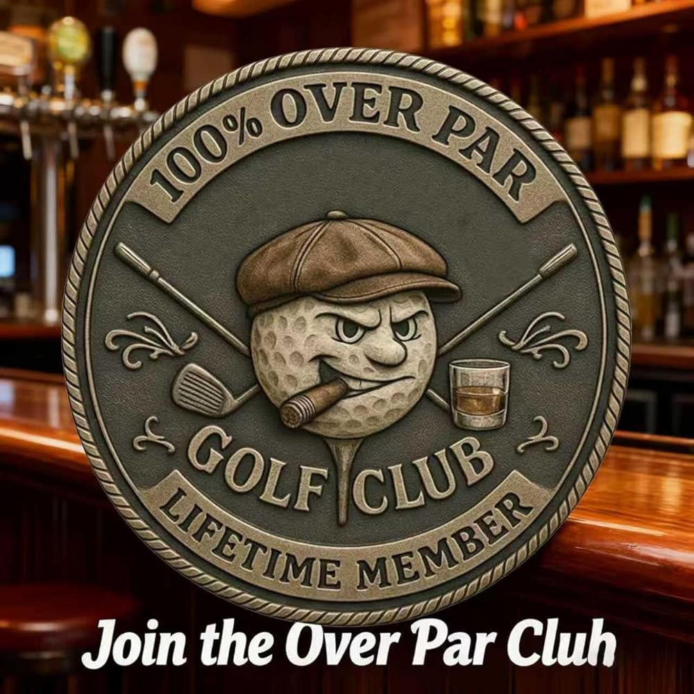 Edgy Inscription: With bold inscriptions like “100% OVER PAR” and “LIFETIME MEMBER,” this golf challenge coin captures the essence of old golf club humor.