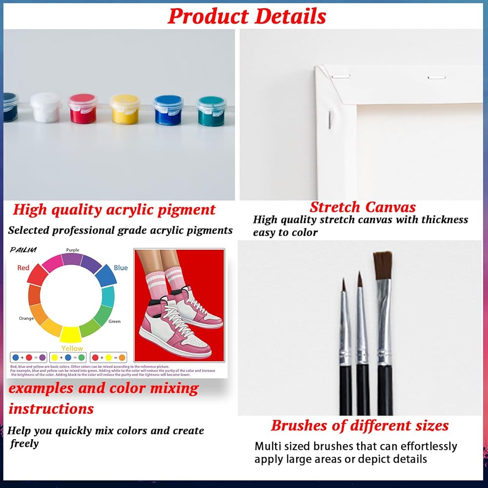 • مجموعة طلاء الكل في واحد: تتضمن عبوتين من القماش الممتد المرسوم مسبقًا مقاس 8 × 10، و16 لونًا أكريليكًا حيويًا، و6 فرش طلاء عالية الجودة، و2 لوحتين وعينتين من الصور للإلهام.