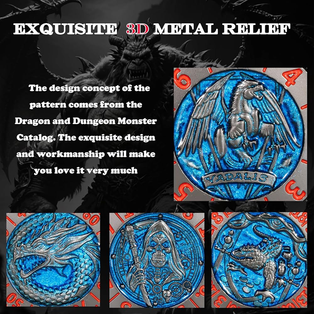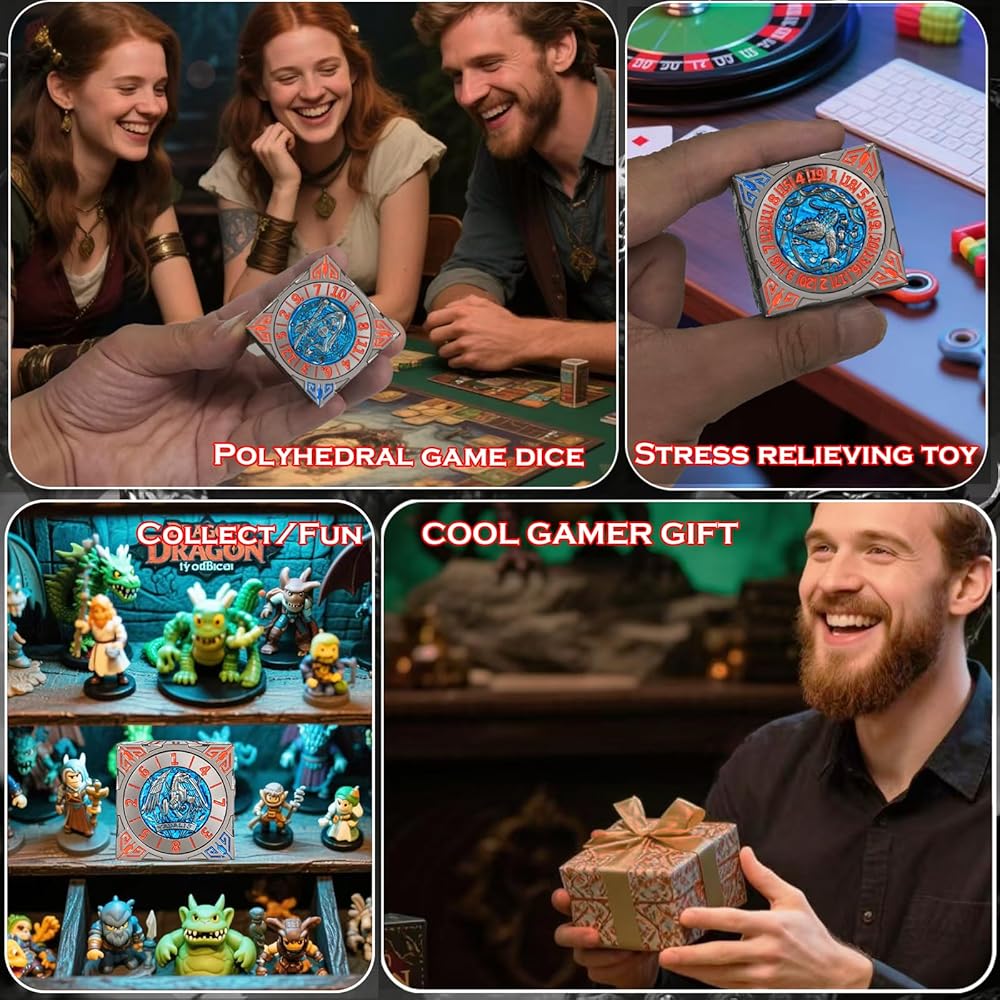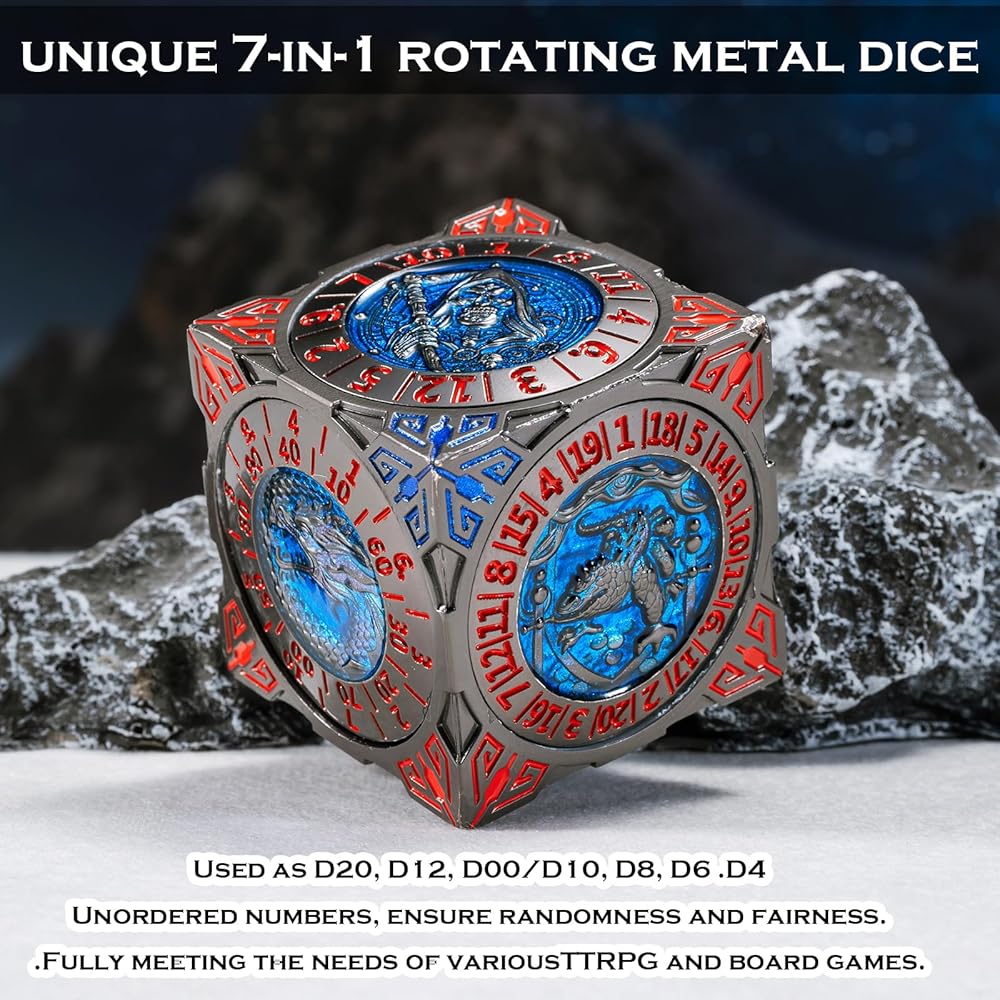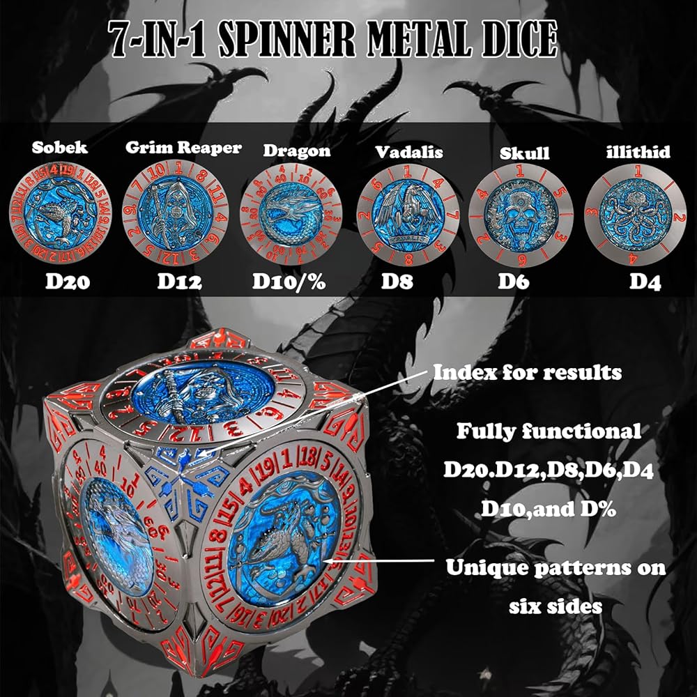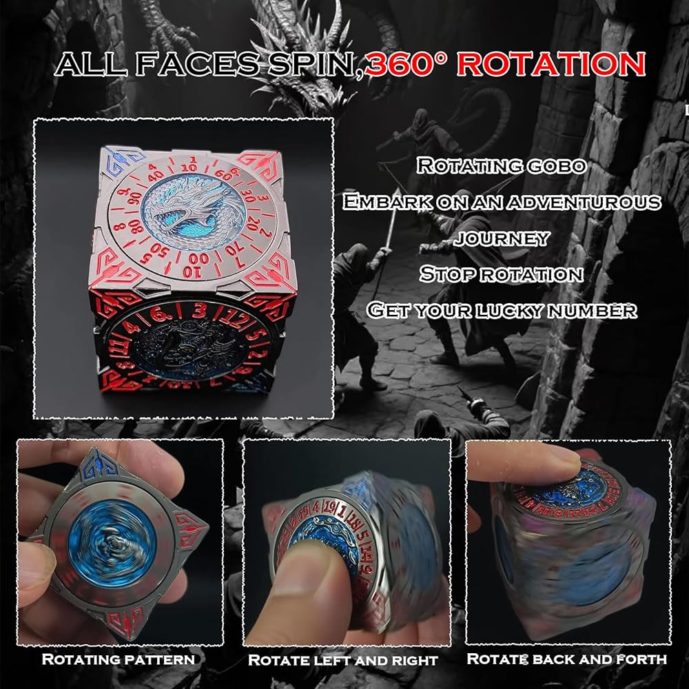 This exquisite all-in-one dice set includes spinner dice, mechanical dice spinners, giant 7-in-1 metal polyhedral DND dice, MTG spindown dice, and foldable spinner dice. They enhance your tabletop gaming experience with beautiful dragon motif designs. The antique bronze surface treatment gives these metal DND dice, metal RPG dice (D&D), DND spinner dice, dragon spinner dice, 7-in-1 DND pocket spinner dice sets a vintage and mysterious look, making them perfect for fantasy role-playing game adventures, D&D gifts, DND dice spinners, 7-in-1 dice spinners, D&D spinning dice, metal dice sets, and polyhedral dice sets, which include multiple dice with different face values. They come stored in a hinged metal box with an elegant gear-style digital display. Each metal die, D&D die, polyhedral die, and spinner dice set is meticulously crafted, featuring clear, easy-to-read numbers and prominent dragon designs that add personality to every roll. DND spinner dice, dice spinner mechanical dice, DND metal dice, DND dice sets, spinner dice DND, dragon dice are moderately weighted, made from high-quality metal for a comfortable feel and realistic rolling action. These D20 spinners, spinner DND dice, DND dice sets, role-playing dice, metal D&D dice, DND dice spinners, all-in-one dice are ideal for ‘Pathfinder,' and other tabletop role-playing games that emphasize style and quality. The compact, portable box not only protects the 7-in-1 DND pocket spinner dice set, spinning dice, DND spinner dice, D&D dice sets, metal DND dice, and DND Christmas dice but can also serve as an impressive display piece when not in use. Whether you're an experienced dungeon master or a new gaming enthusiast, this dice spinner, DND dice spinner, D&D dice set, DND dice metal set, unique DND dice set combines functionality and artistic charm to create truly unforgettable gaming moments.