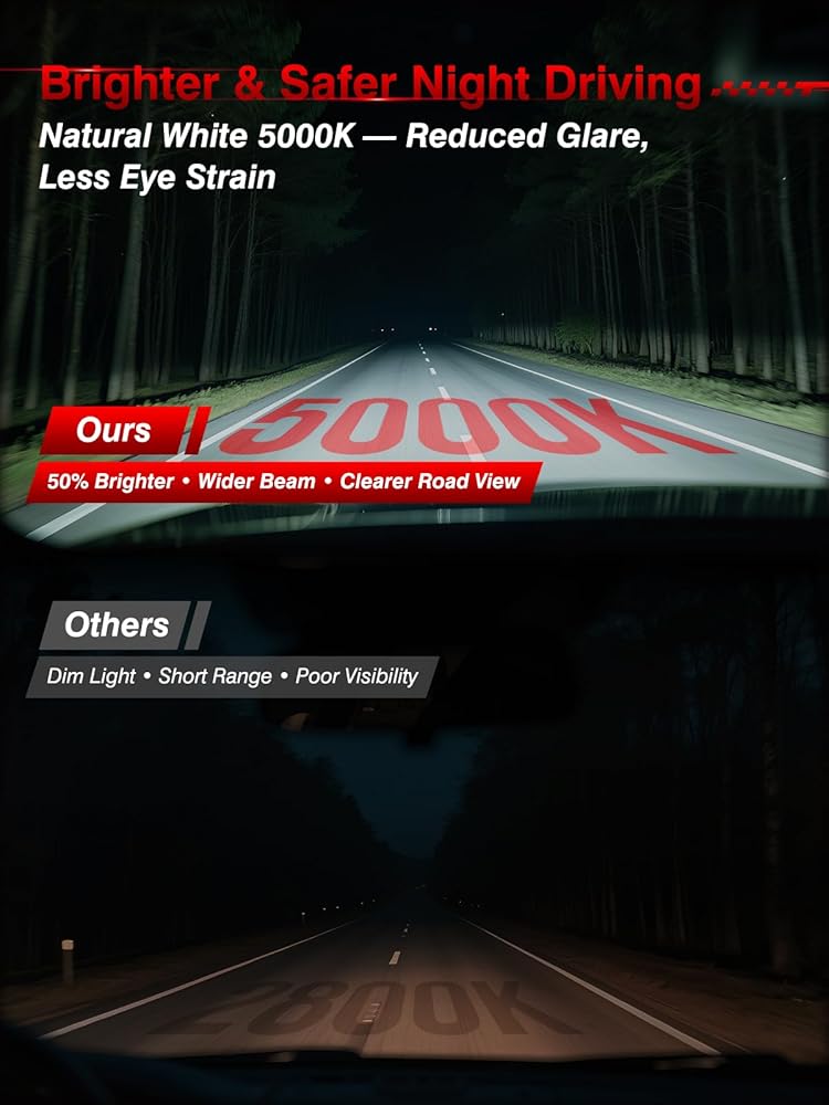 [مخرج ضوء أبيض بارد 5000 كلفن] توفر مصابيح H7 إضاءة بيضاء باردة واضحة بقوة 5000 كلفن، وتنتج سطوعًا نظيفًا يشبه ضوء النهار مما يعزز التباين ويقلل من إجهاد العين. ترقية رائعة لاستبدال لمبة المصابيح الأمامية ذات الشعاع المنخفض أو استخدام الشعاع العالي، مما يمنح سيارتك مظهرًا عصريًا