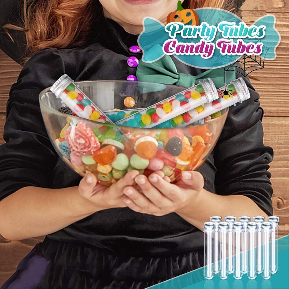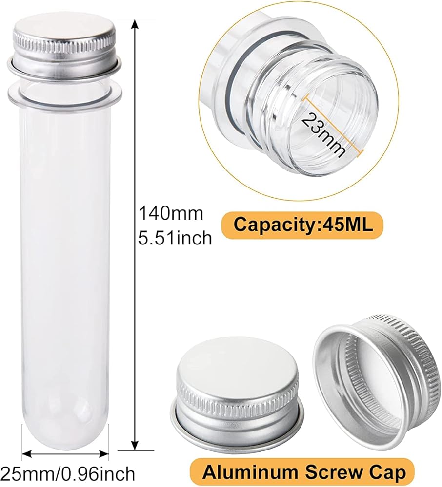 Product size: Clear plastic test tube is 5.5” in length, 1” in diameter, the cube capacity is 45ml. Perfect plastic tube for you storing gumball, candy, jelly, chocolate bean, cookie nuts packaging.