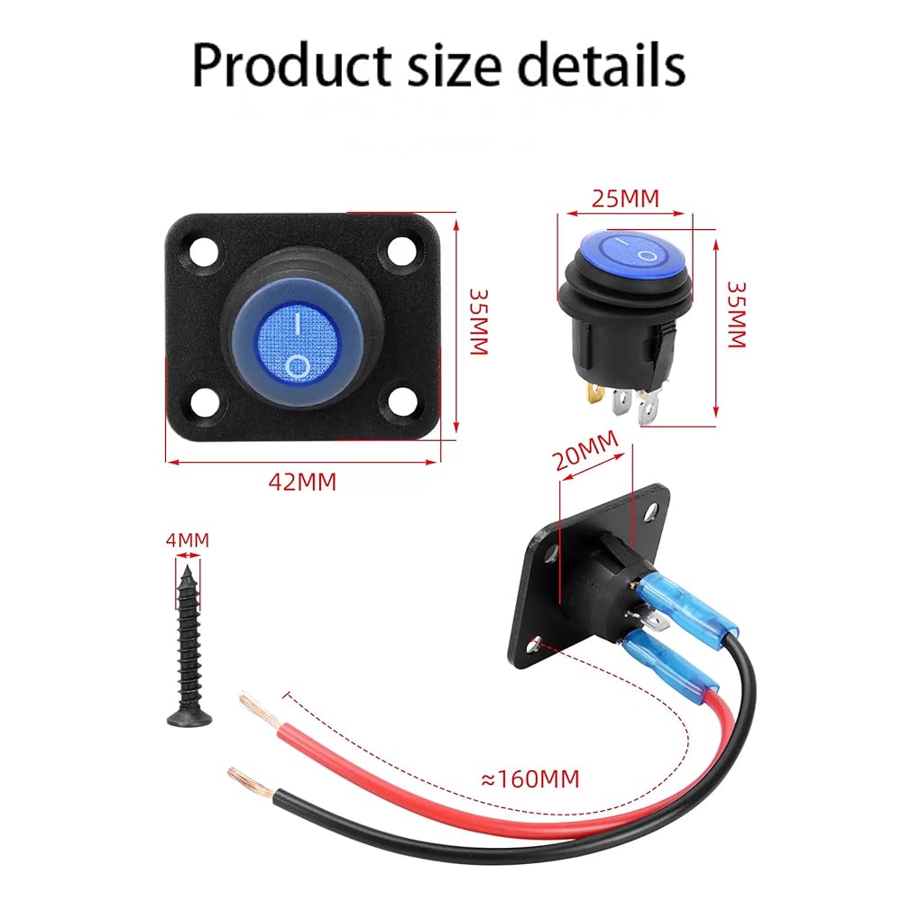 أبعاد اللوحة: حجم لوحة التبديل الروك: 42 مم (طول) × 35 مم (عرض)؛ قطر فتحة التركيب: 20 مم (يتضمن مفتاح LED أزرق مقاوم للماء). معبأة في مجموعات من 2.