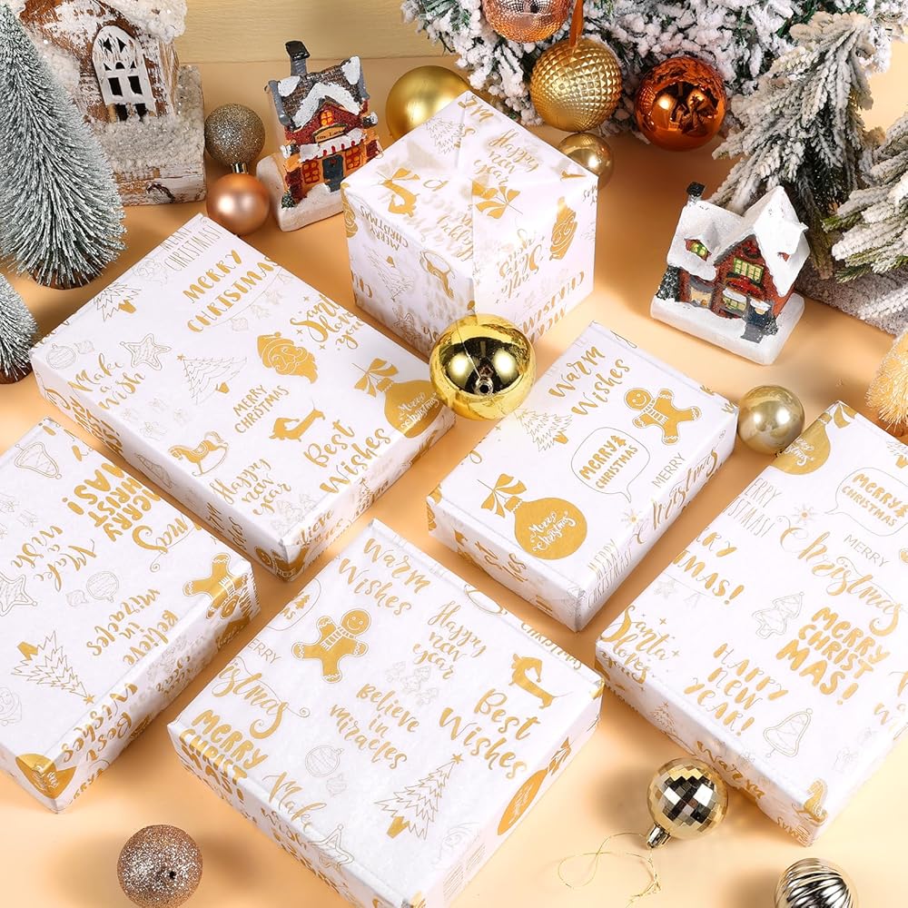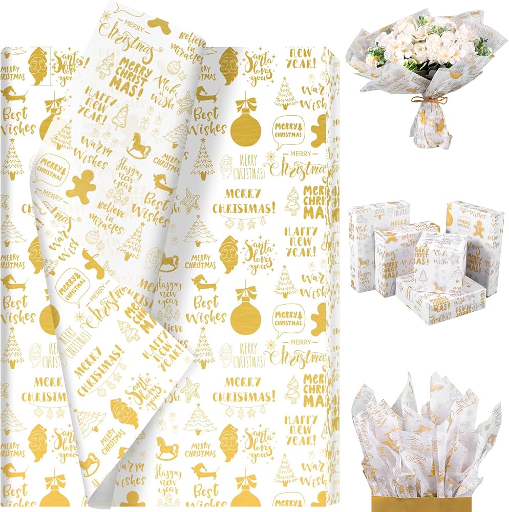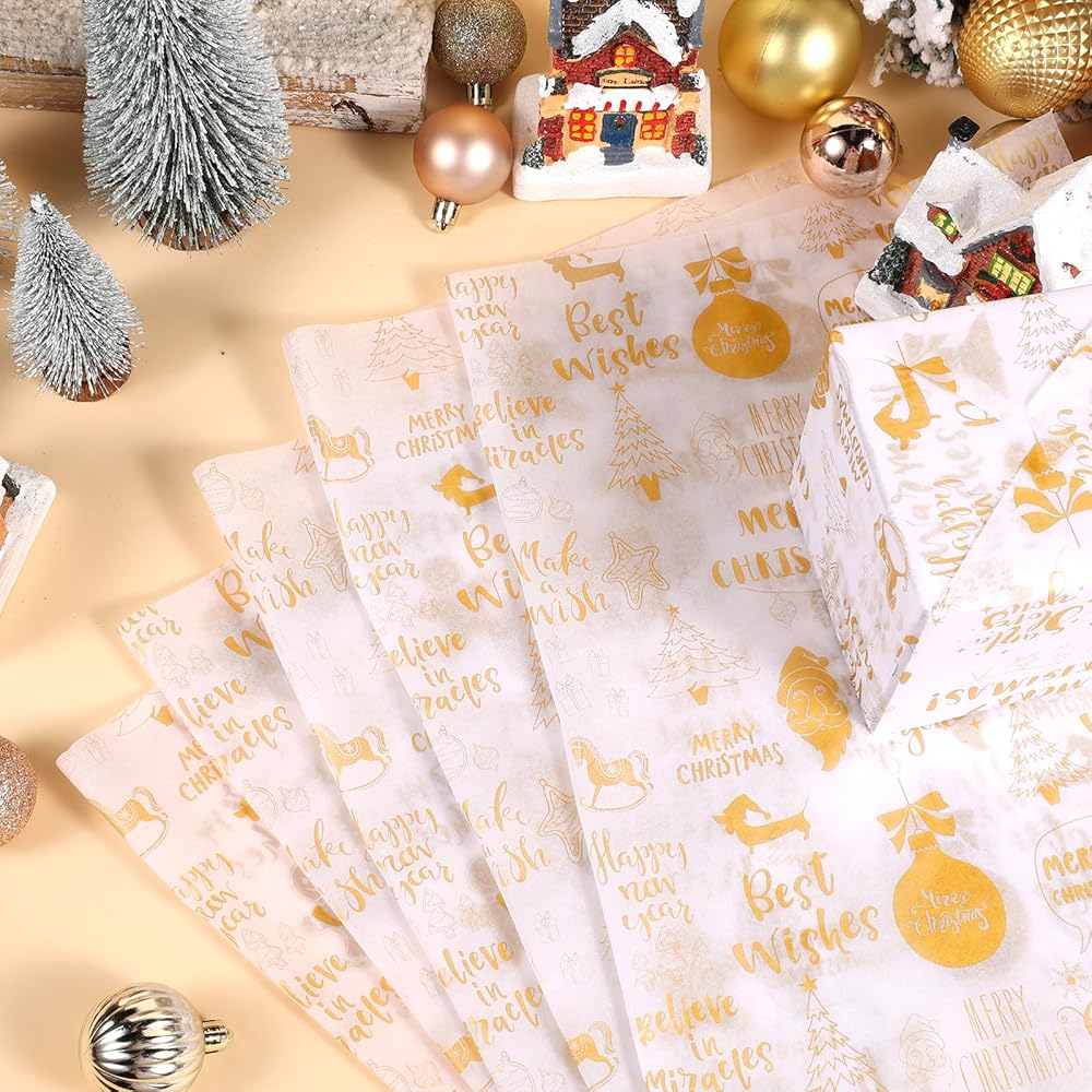 • 🎅🌲🎅【Christmas Greetings】 - Our Christmas tissue paper is printed in gold color, and designed with seamless Christmas greetings words - Merry Christmas, Santa Love You, Happy New Year and Best Wishes, etc, full of Christmas atmosphere, suitable for Xmas, winter home day and Happy New Year parties, creating a relaxed and elegant experience!