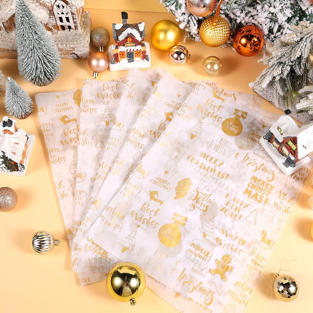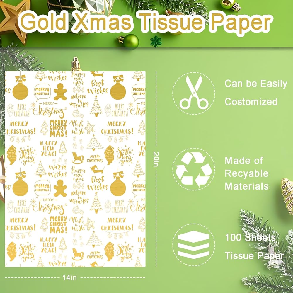 • 🎅🌲🎅【Value Package】 - Package includes totally 100 sheets tissue paper in Christmas - themed letters patterns, in gold colors, sufficient to meet your needs for Christmas art crafts making or winter home day gift wrapping, and you can share with your friends to DIY, would add more fun to your Xmas DIY crafts.