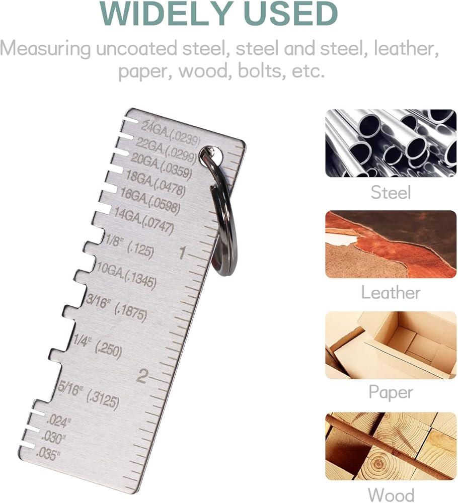 【يستخدم على نطاق واسع】 هذا مناسب لألواح الحديد والفولاذ والورق والجلد والمسمار والخشب وما إلى ذلك. وفي الوقت نفسه، فإن مقياس سمك أحجام أدوات اللحام يستخدم أيضًا لقياس أسلاك الصفائح المعدنية.