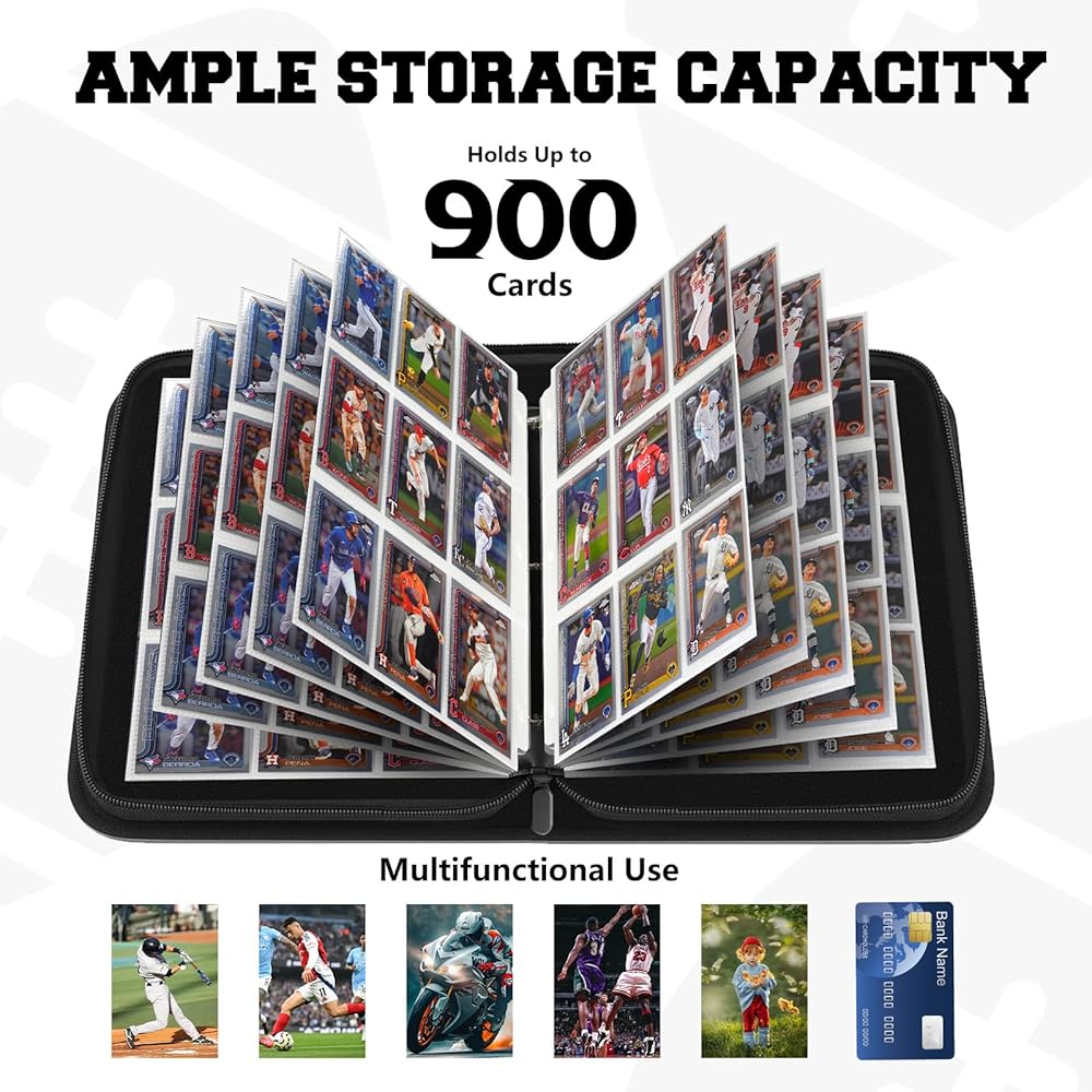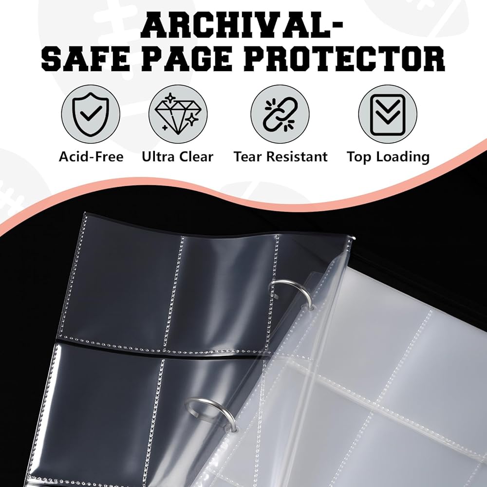 سعة تخزين كبيرة ومرنة: تتميز بأكمام ذات 9 جيوب على الوجهين + 50 صفحة قابلة للفصل، قادرة على استيعاب ما يصل إلى 900 بطاقة ذات حجم قياسي. يسمح التصميم ثلاثي الحلقات بإضافة أو إزالة الصفحات مجانًا لسهولة التنظيم