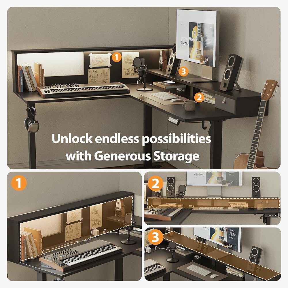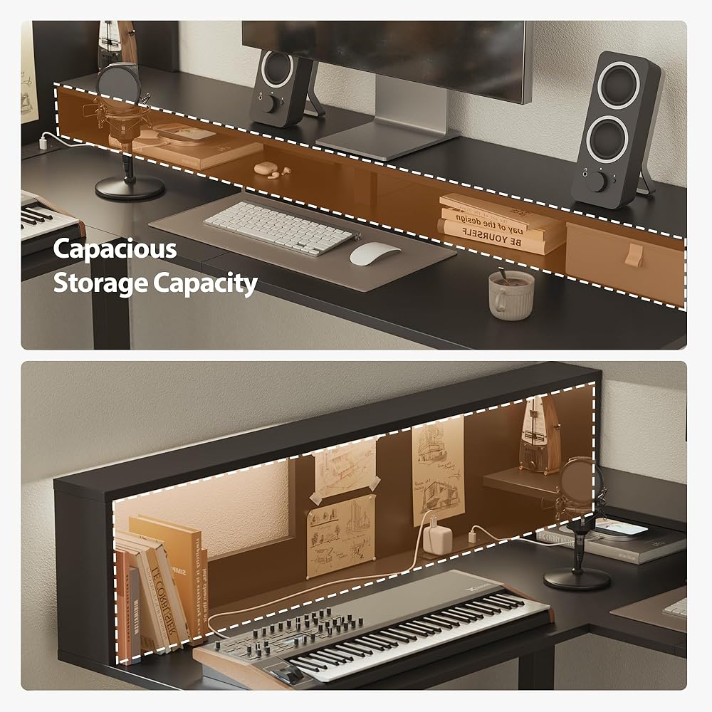 - 【على شكل حرف L مع القفص】تصميم على شكل حرف L موفر للمساحة مع رف مرتفع للشاشات أو الكتب أو الديكور. يناسب بشكل مريح في الزوايا.