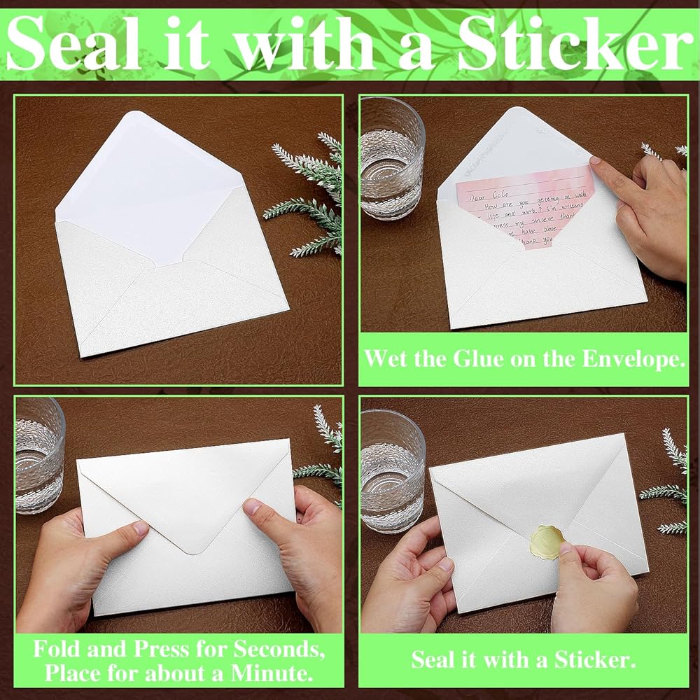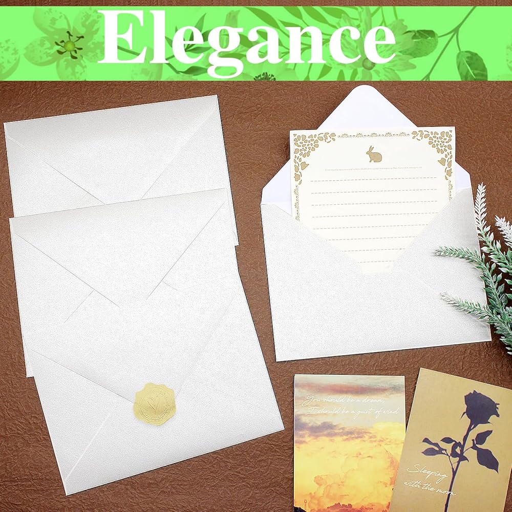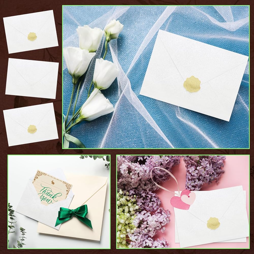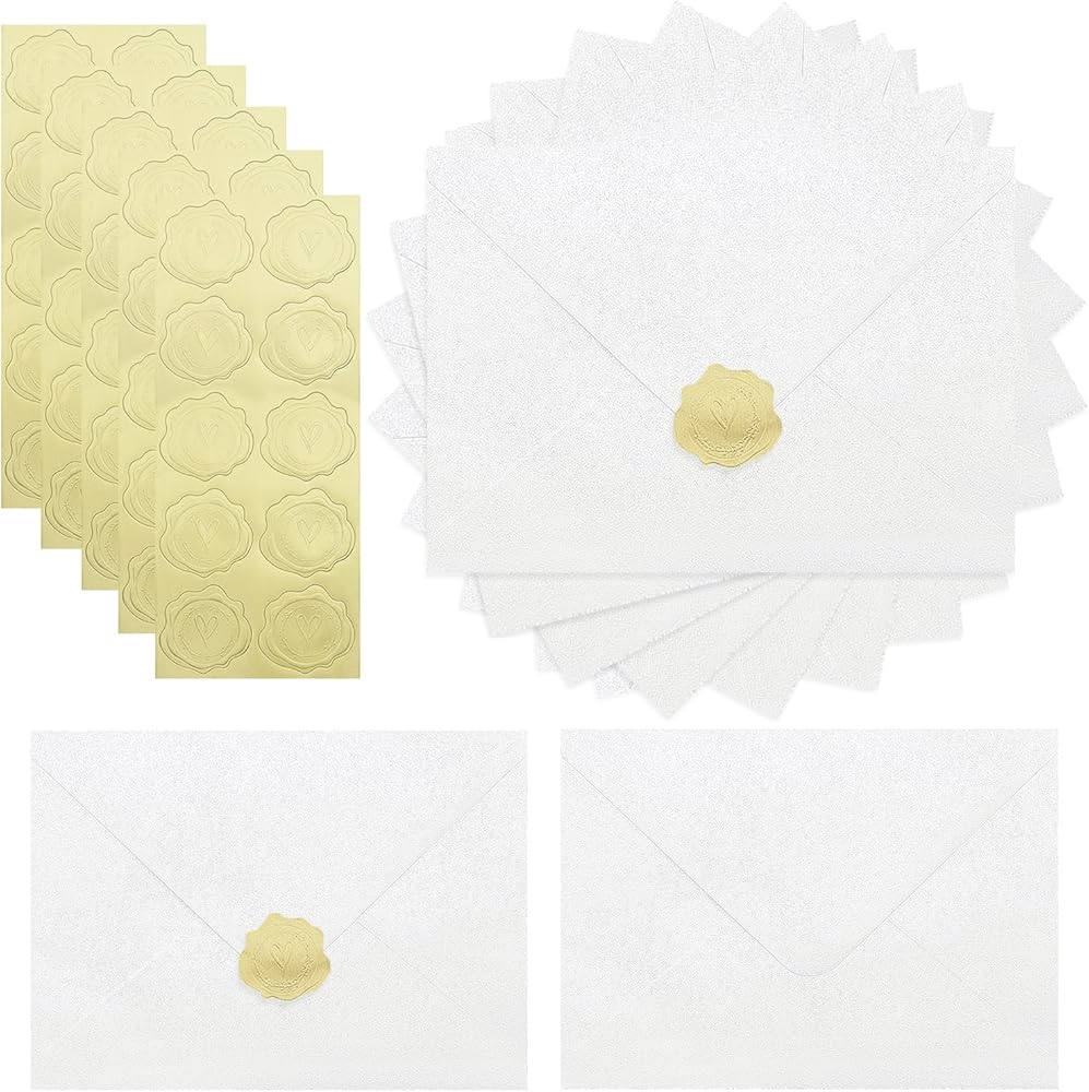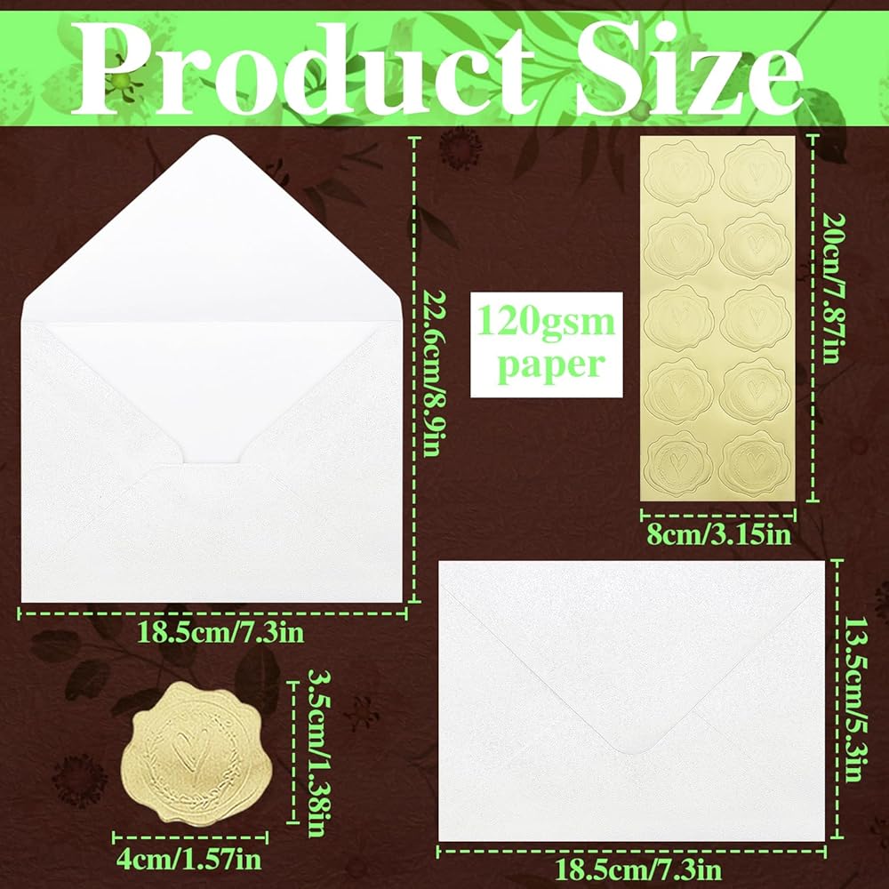 مجموعة أنيقة ومتكاملة: تأتي كل عبوة مع 50 ظرفًا لؤلؤيًا مقاس 5×7 و50 ملصقًا ذهبيًا، وهي الحل المثالي لاحتياجاتك القرطاسية الخاصة. رائعة لحفلات الزفاف وأعياد الميلاد ومناسبات العطلات.