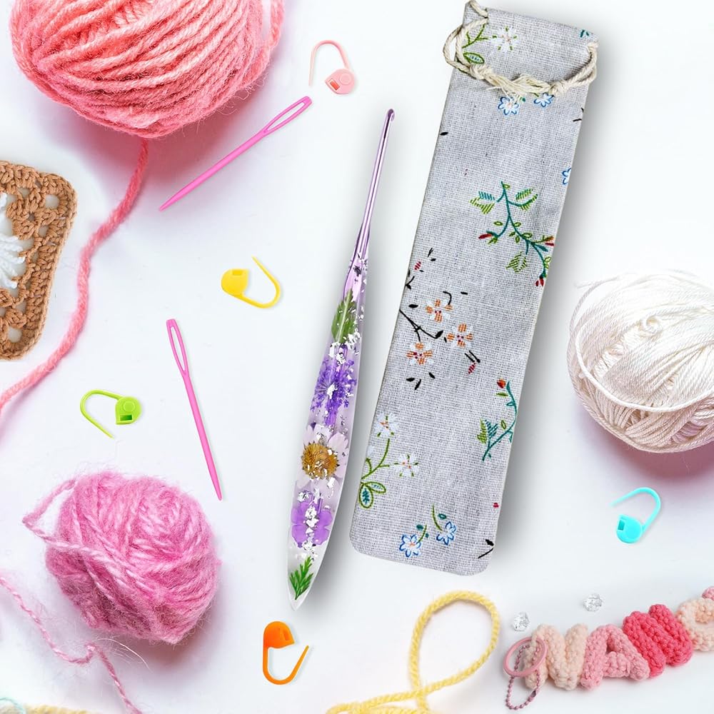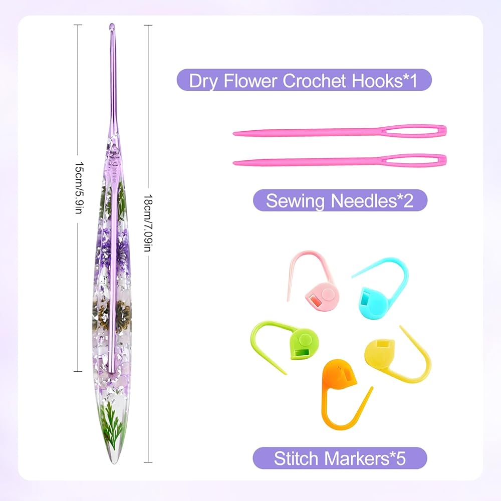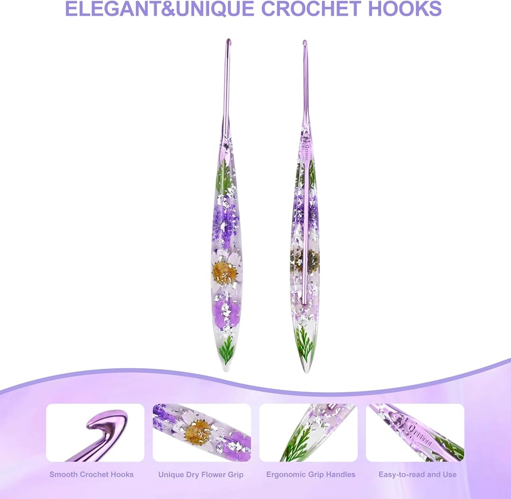 مقابض خطافات كروشيه الزهور المجففة: تتميز خطافات الكروشيه المريحة بمقابض راتينج شفافة أكثر راحة من السيليكون، وأسهل في الإمساك من المعدن، بالإضافة إلى ذلك، خطافات الكروشيه مزينة بالزهور المجففة، وتجمع بين العملية والأناقة، مما يسمح لك بالاستمتاع الكامل بالكروشيه.