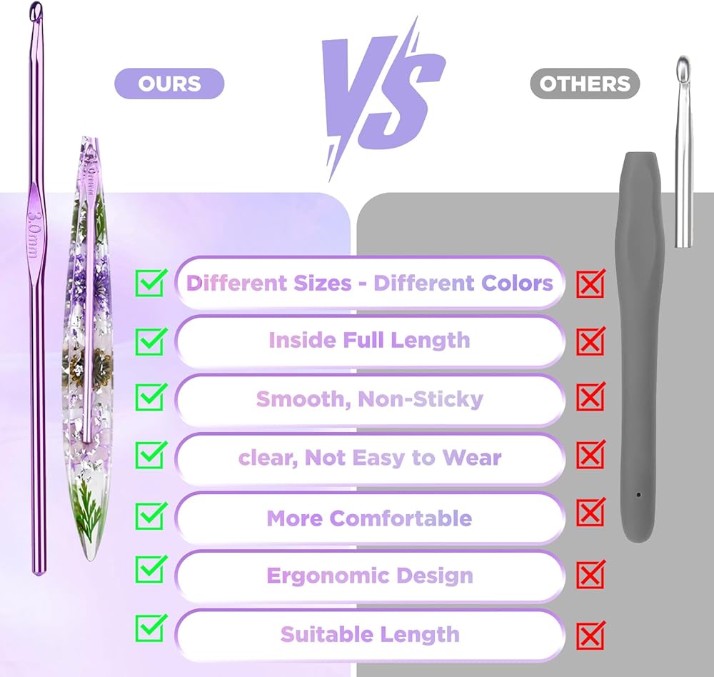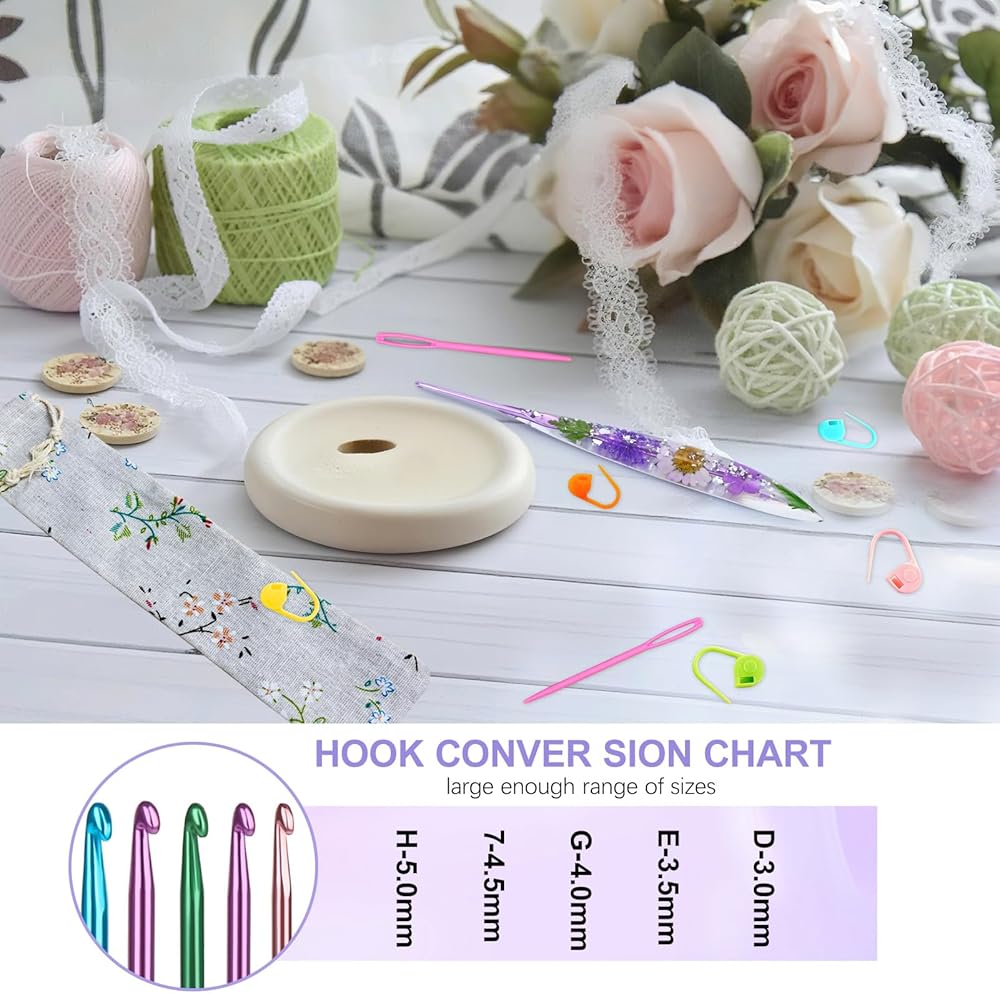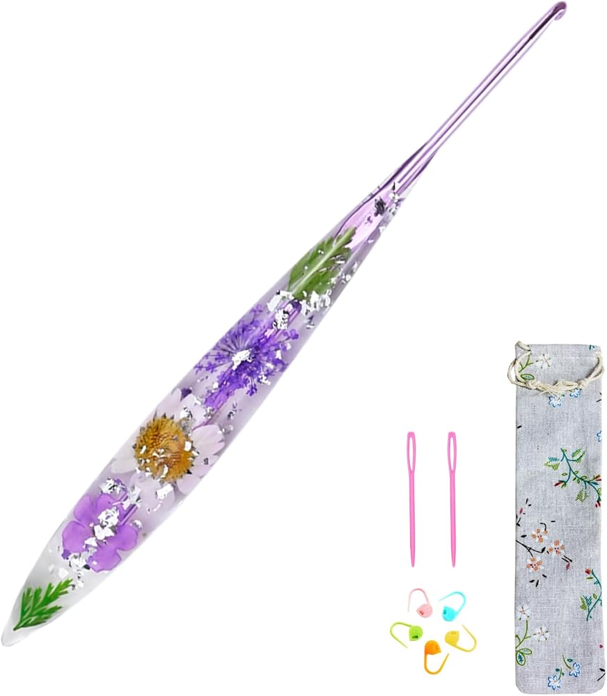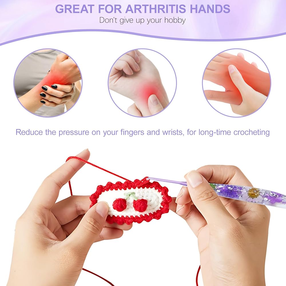 مقابض خطافات كروشيه الزهور المجففة: تتميز خطافات الكروشيه المريحة بمقابض راتينج شفافة أكثر راحة من السيليكون، وأسهل في الإمساك من المعدن، بالإضافة إلى ذلك، خطافات الكروشيه مزينة بالزهور المجففة، وتجمع بين العملية والأناقة، مما يسمح لك بالاستمتاع الكامل بالكروشيه.