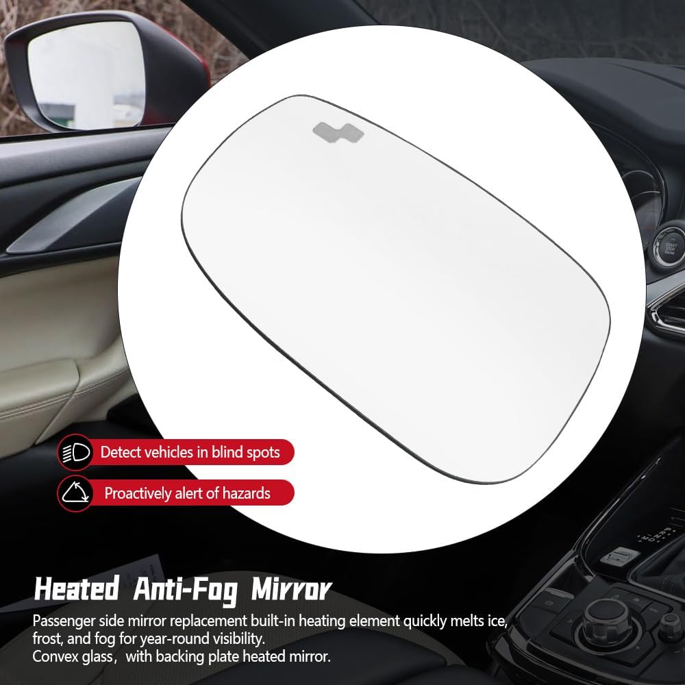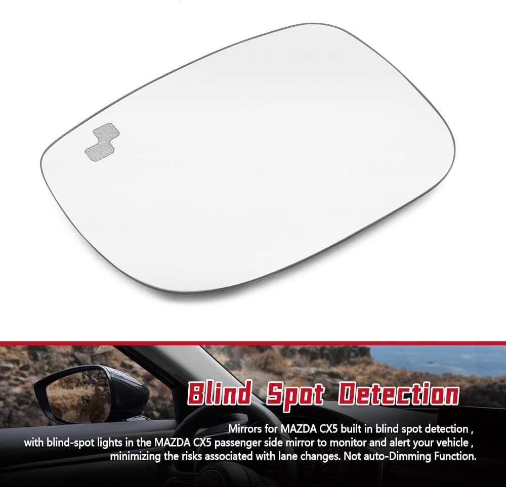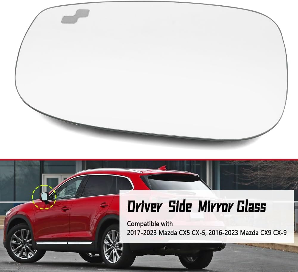 Compatible with the left side mirror glass replacement parts of the Mazda CX5 2017-2023 and CX9 2016-2023 models, with heating and blind spot functions, tempered glass with durable backplate, easy installation, and 60% lower maintenance costs than the original factory