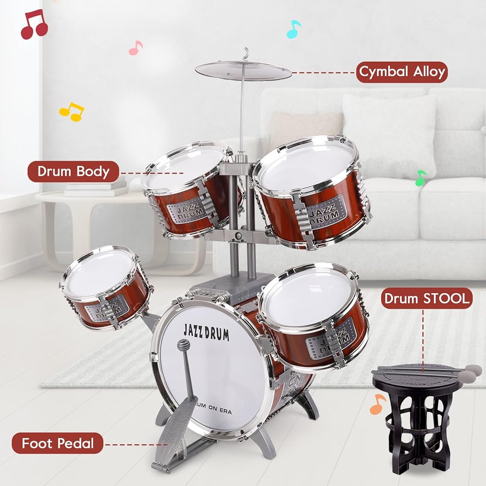 مجموعة طبول Space Them: تتضمن مجموعة طبول الأطفال 4 طبول سنير، 1 طبلة جهير مع دواسة قدم، 2 عصا طبلة، 1 صنج و1 مقعد