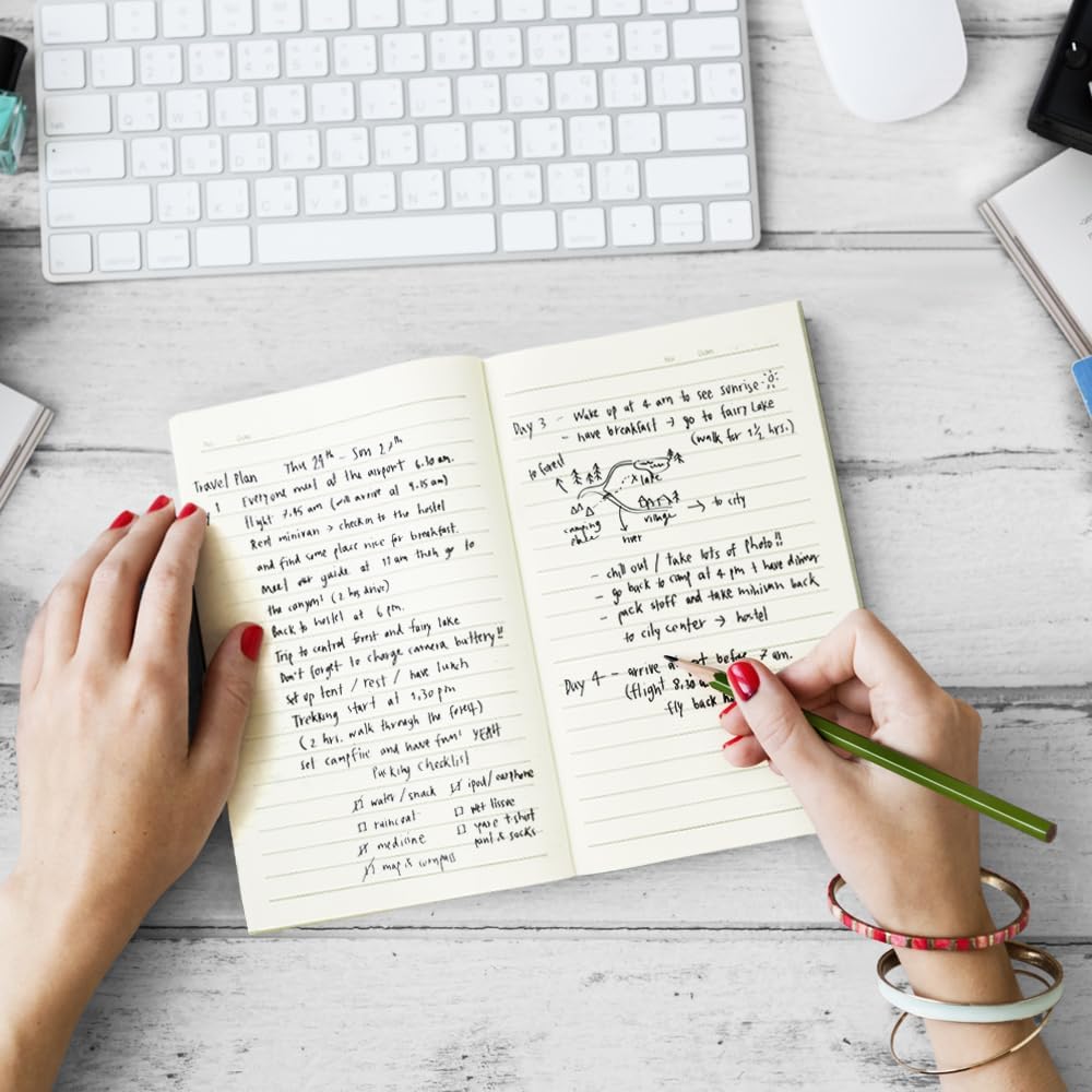 ورق دفتر الملاحظات: يمكن وضع علامة على كل ركن من أركان الصفحة بتاريخ أو ملاحظة، مما يجعل من السهل العثور على المحتوى الذي تحتاجه حسب التاريخ. يتميز كل من أجهزة الكمبيوتر المحمولة مقاس A5 وB5 بخفة الوزن وسهولة الحمل، مما يضيف الراحة إلى حياتك