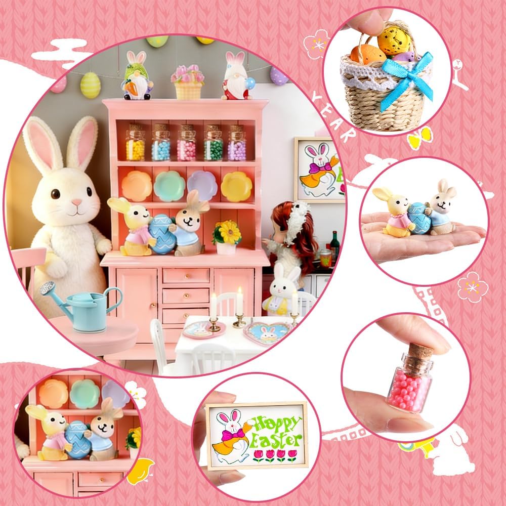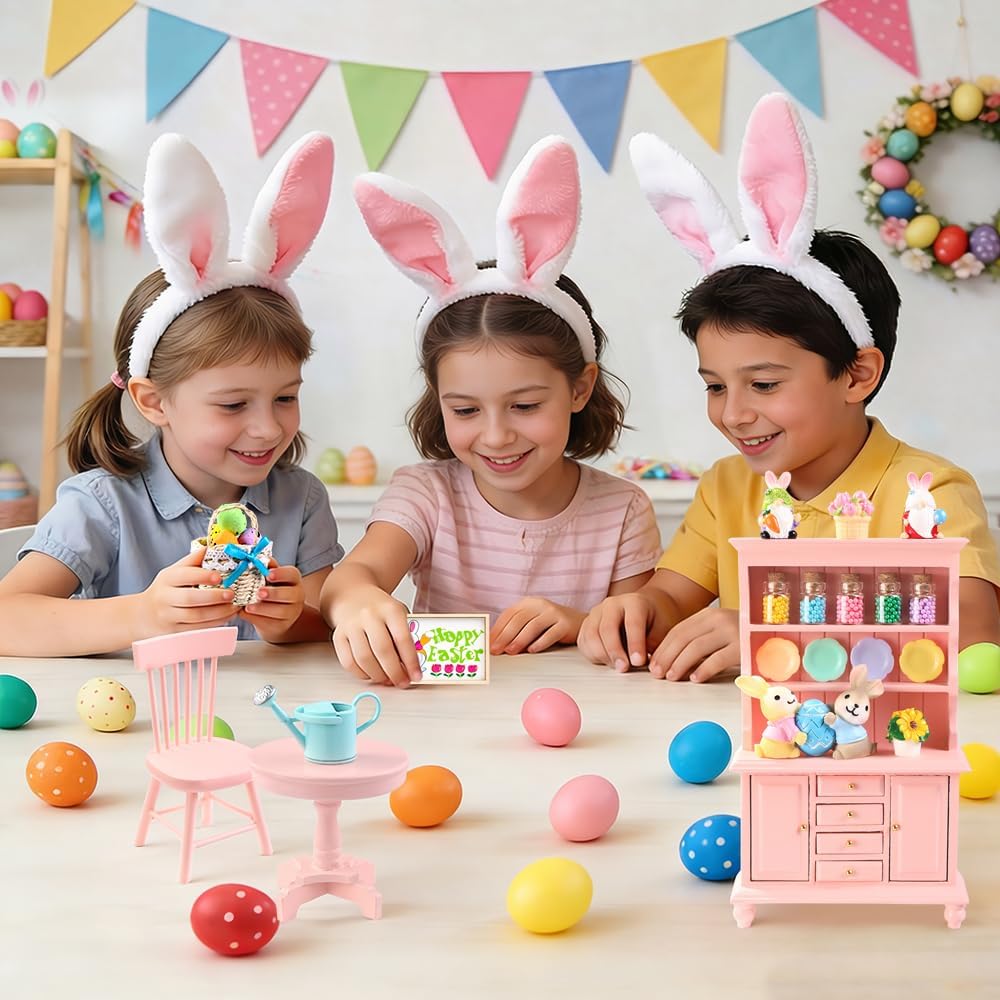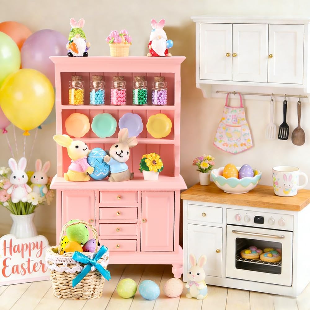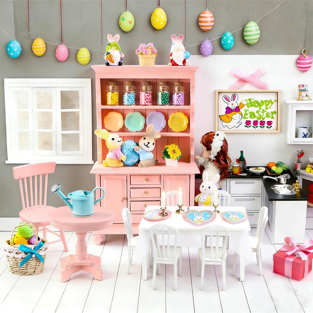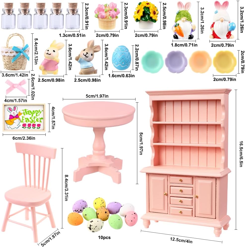38 قطعة من زخارف المنمنمات لبيت عيد الفصح بمقياس 1:12 مجموعة أثاث رف الكتب الخشبي الوردي الصغير زجاجات صغيرة وكراسي طاولة وزهور وبيض وعيد الفصح وديكور ربيعي