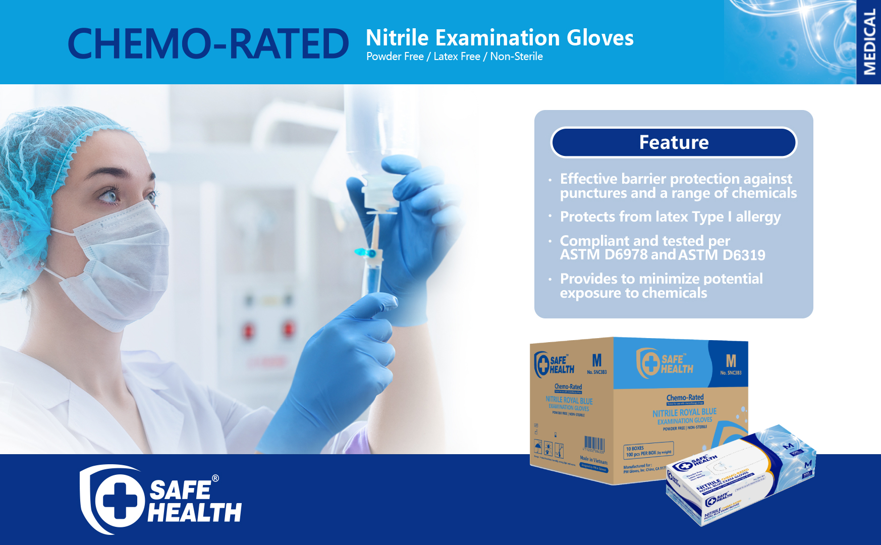 تم اختباره للاستخدام مع أدوية العلاج الكيميائي: متوافق وتم اختباره وفقًا لمعيار ASTM D6978. تقليل التعرض المحتمل للأدوية الخطرة. يبقيك بعيدا عن المواد الكيميائية والحساسية الغذائية.