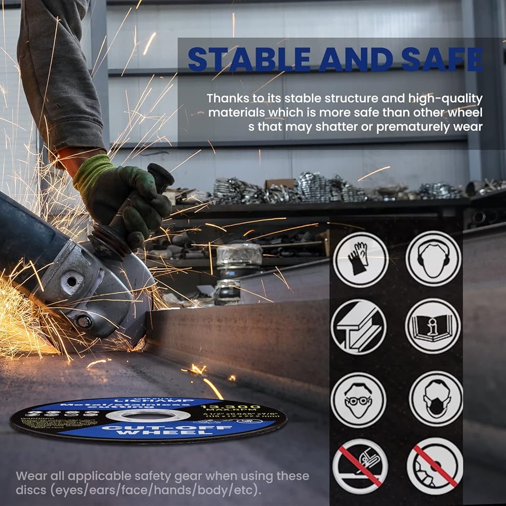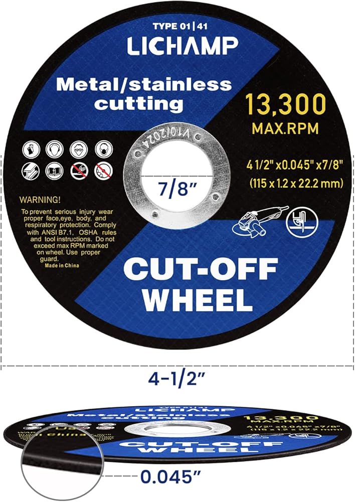 • PERFECT SIZE - Perfectly assembled on all 4-1/2 inches (115mm) angle grinders with 7/8 inch(22.2mm) arbor. Wheel thickness 0.045 inch. Operating up to 13300 RPM (80M/S).