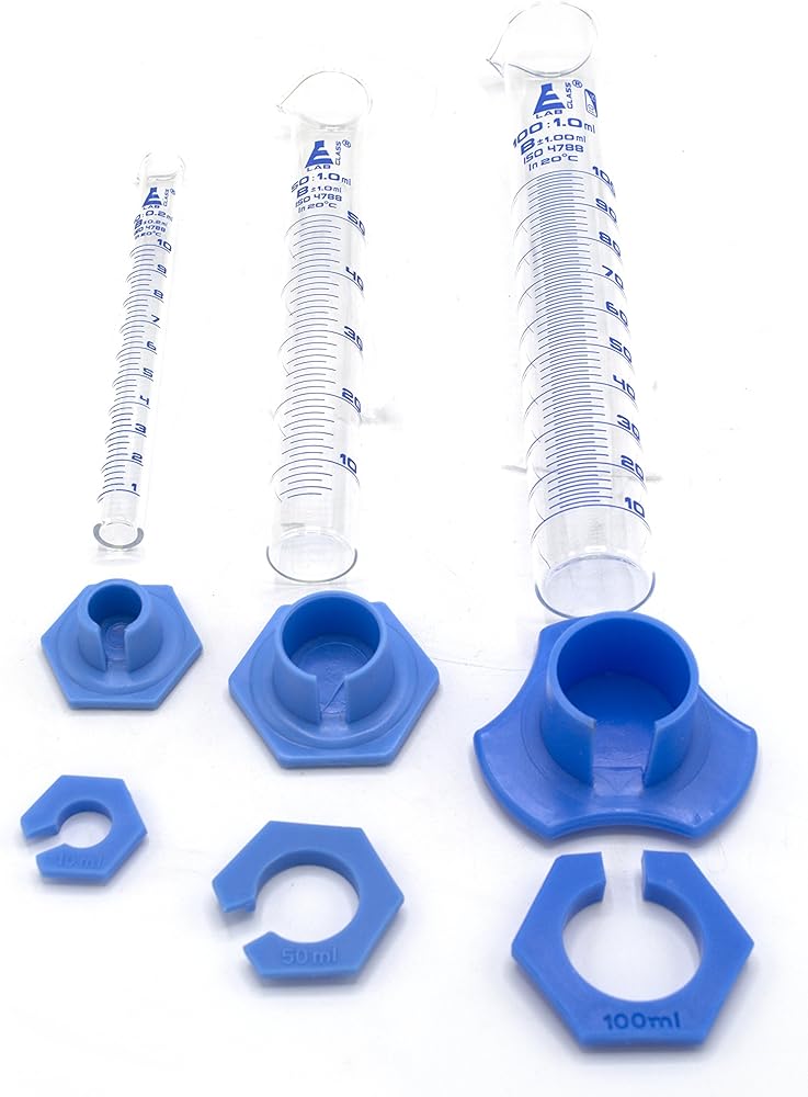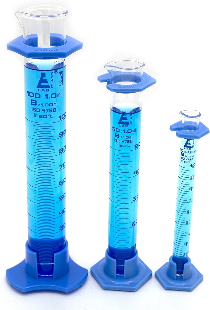 جميع الأسطوانات الثلاثة المتدرجة مصنوعة من زجاج البوروسيليكات عالي التحمل. أحجام الأسطوانة المتدرجة 10 مل، 50 مل، 100 مل. تحتوي جميع الأسطوانات على واقي بلاستيكي وقاعدة بلاستيكية سداسية قابلة للفصل. التخرج على النحو التالي: